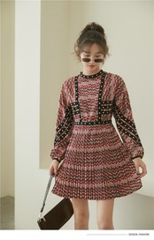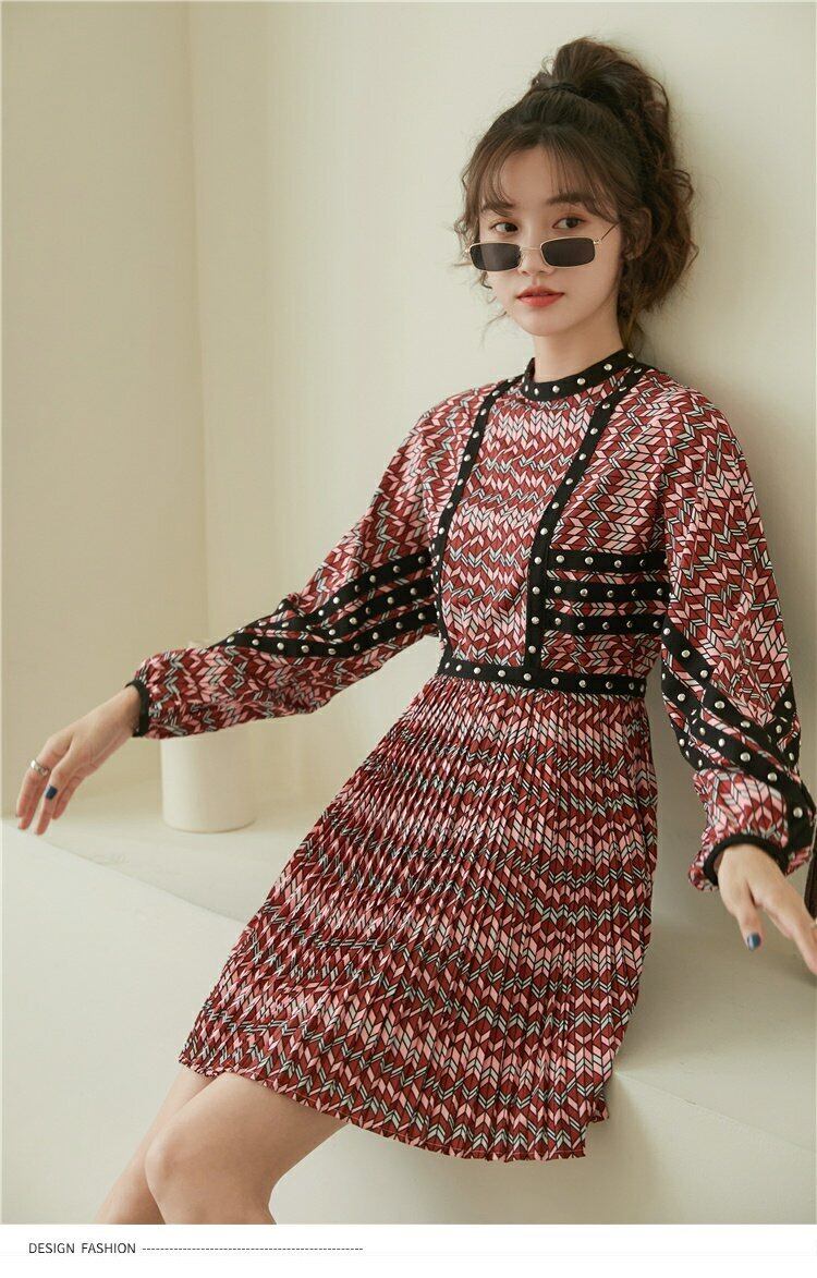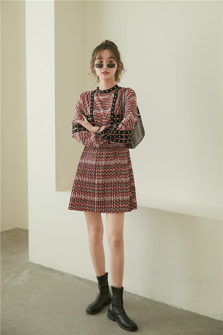 スタイル夏服秋物スリーブスタンダードストライププリーツプリント柄シフォンワンピース ランタンスリーブ レトロ 夏物 オータム GroundMODE241156133615 | pleglad Ground