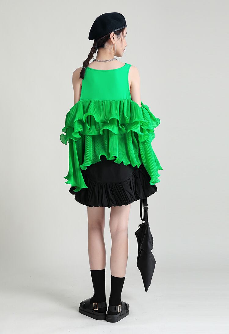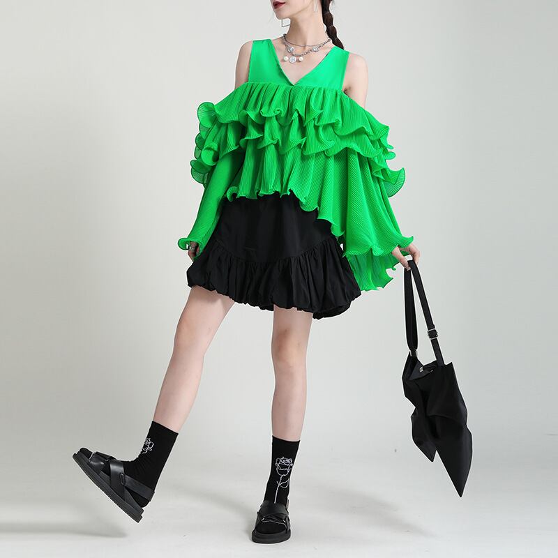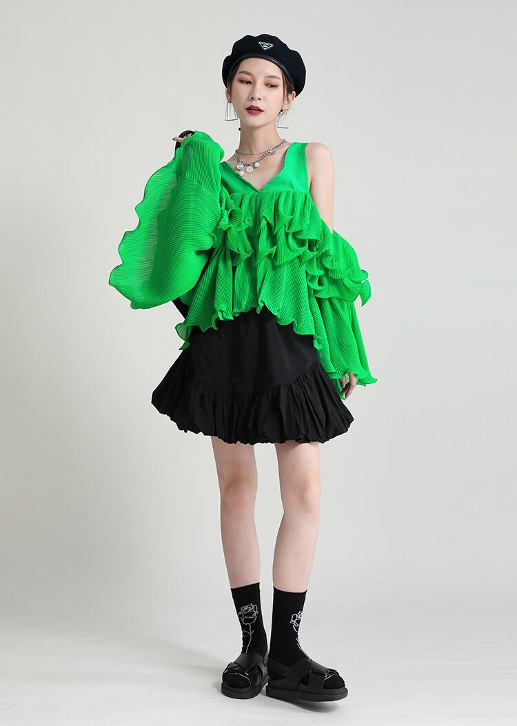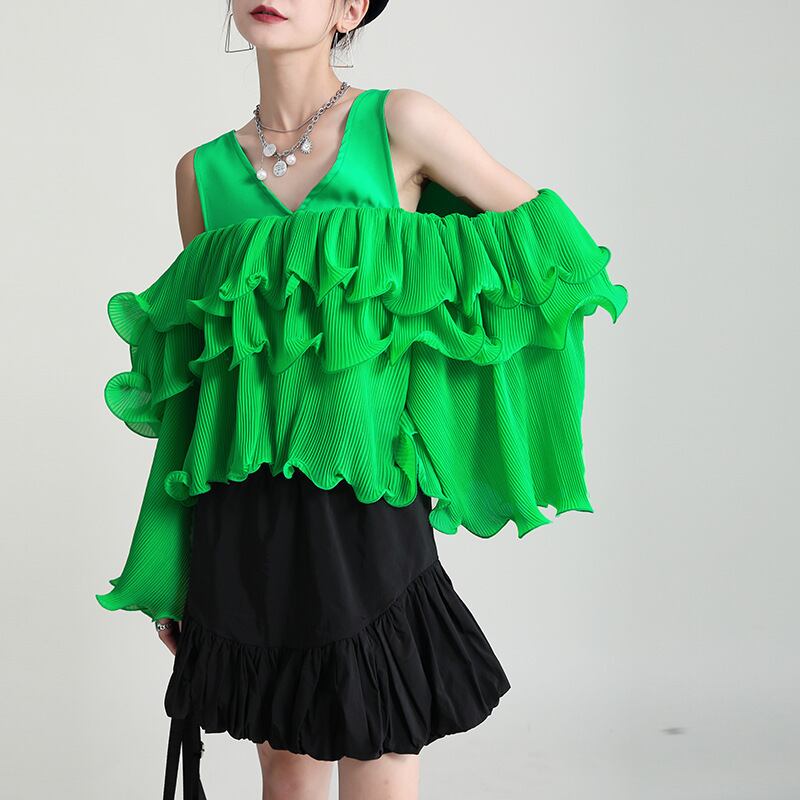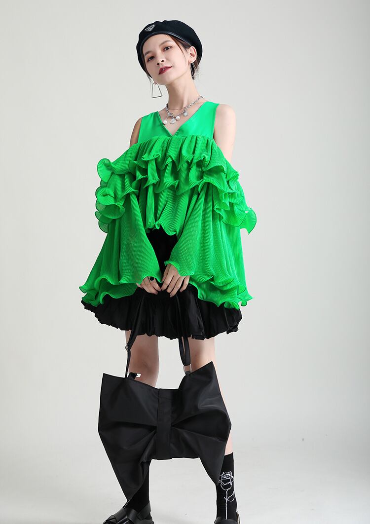 グリーンシフォンソリッド カラールーズスリーブプルオーバー トップス Tシャツレディース ロング レッド オフショルダー ソリッドカラー 長袖 GroundMODE339173768010 | pleglad Ground