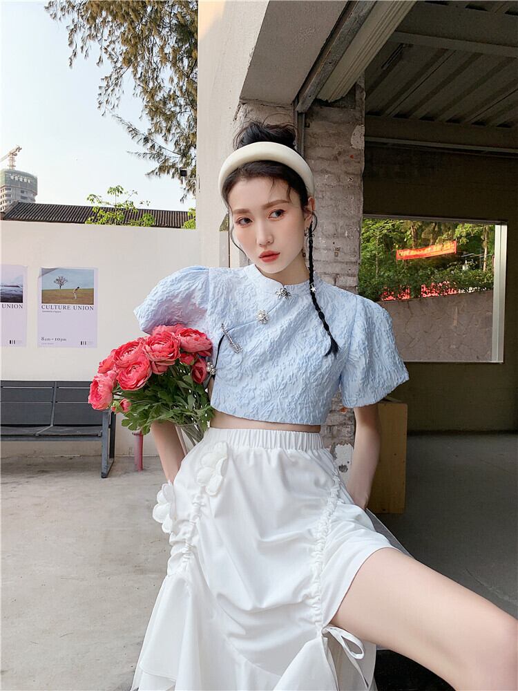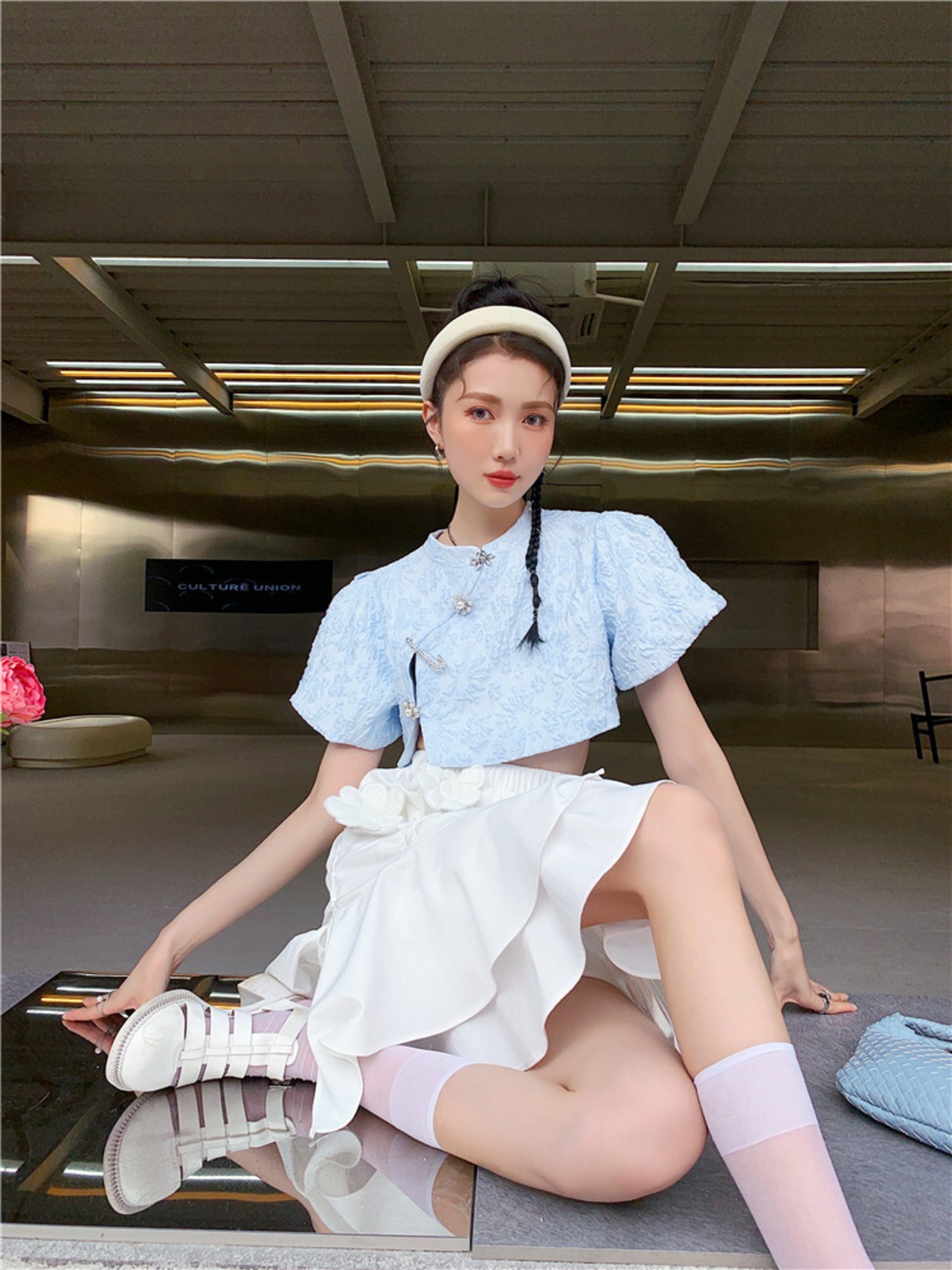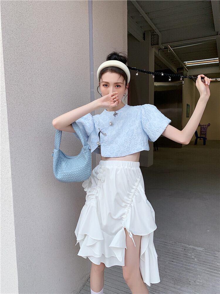 色:ライトブルーのトップ,ホワイトハーフスカートフリーサイズ