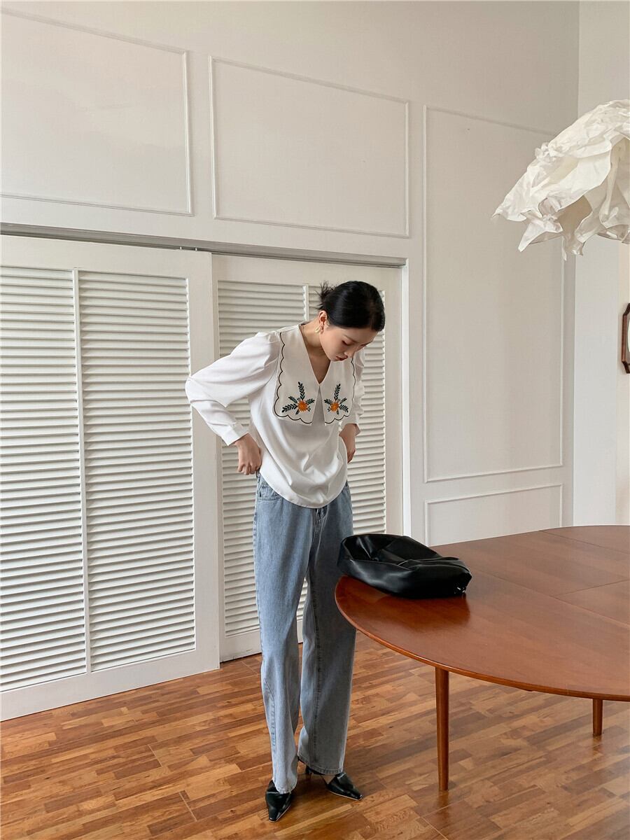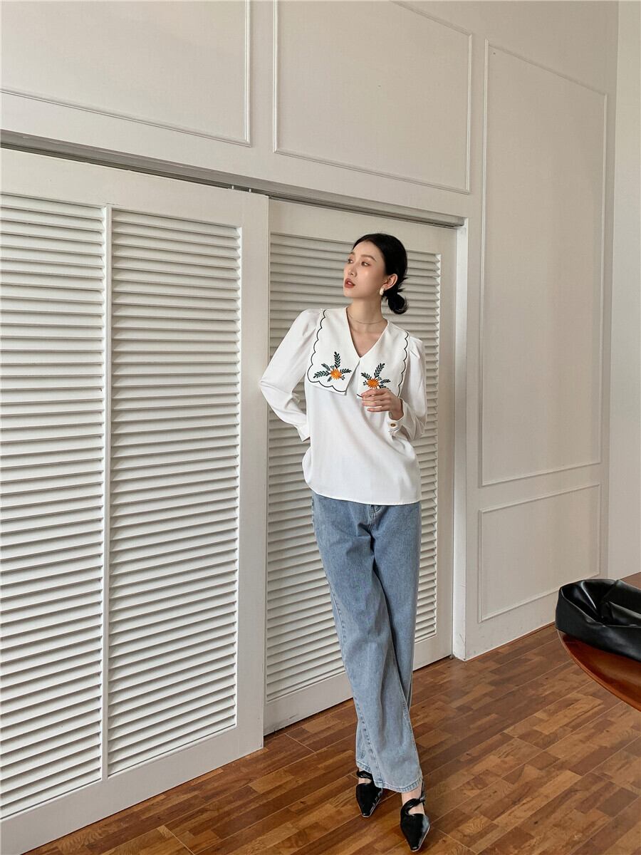 ネイビーカラーFlowerデザイン ホワイトシャツ レディース秋物ルーズスリーブ レッド 刺繍 オータム フラワーデザイン GroundMODE268011148264 | pleglad Ground