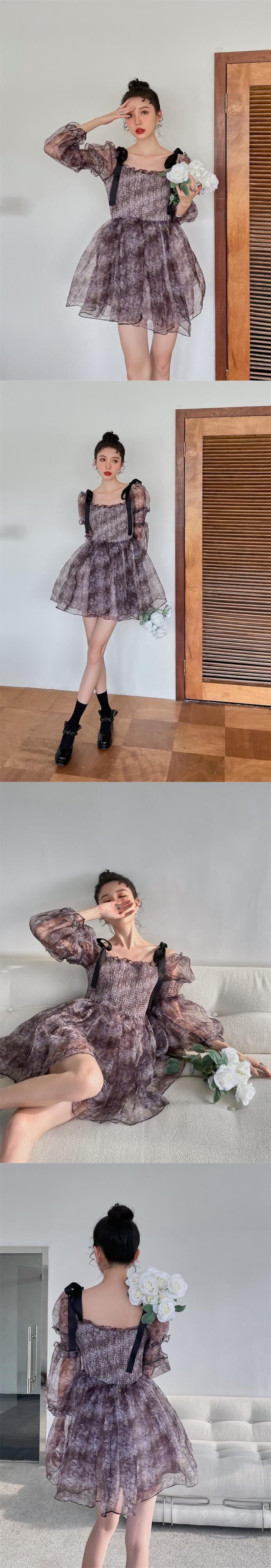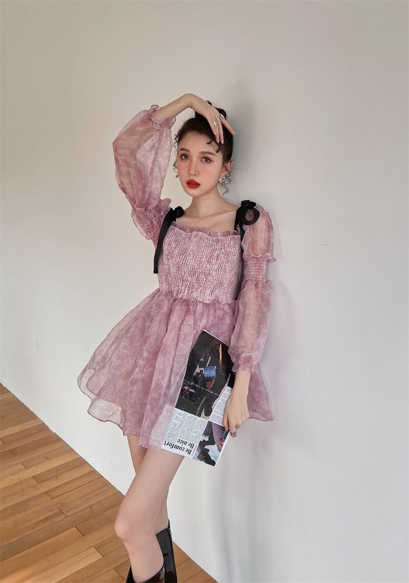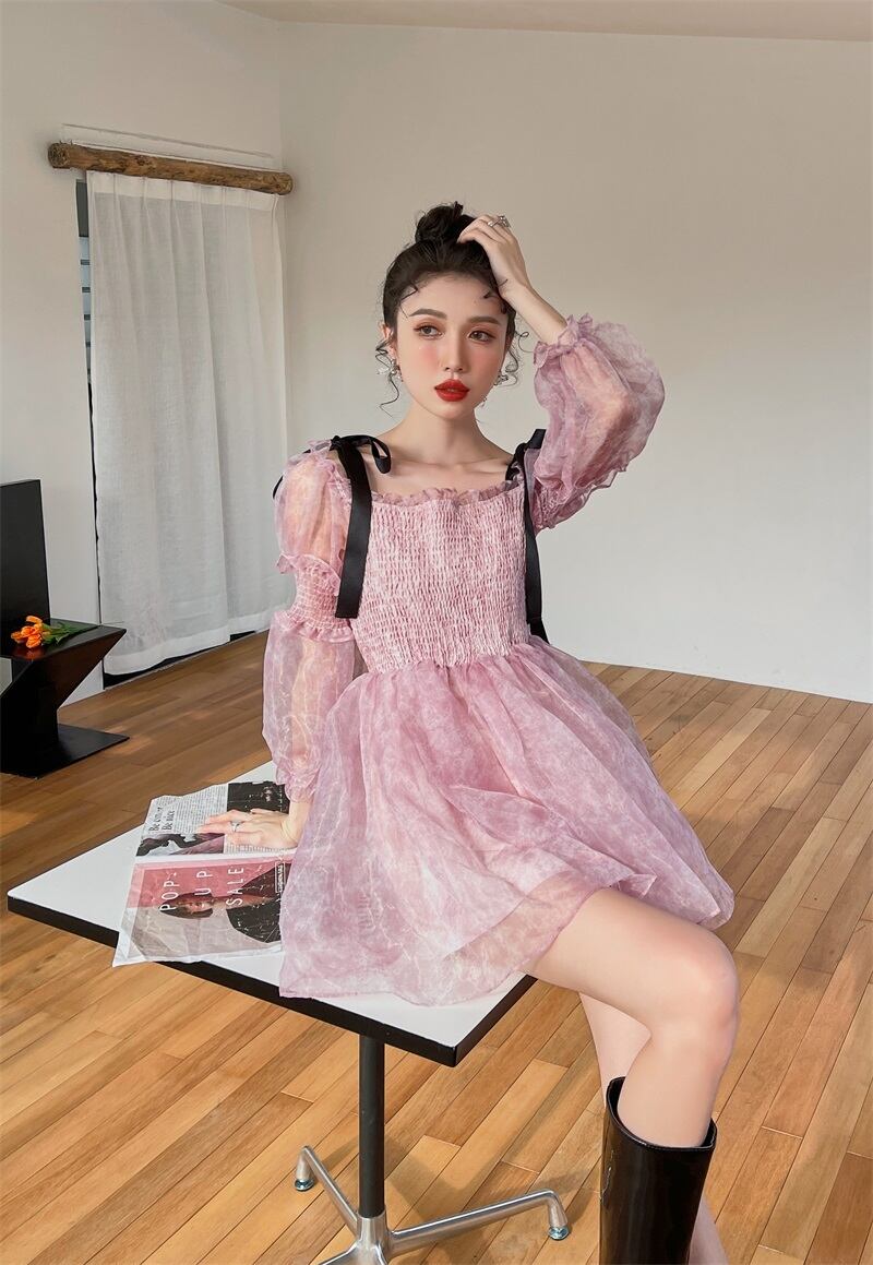 秋物長袖スリーブウェストカラーリボンワンピース ロング 大人ガーリー スウィート キュート カジュアル オータム スクウェア ウエスト GroundMODE22013104634 | pleglad Ground