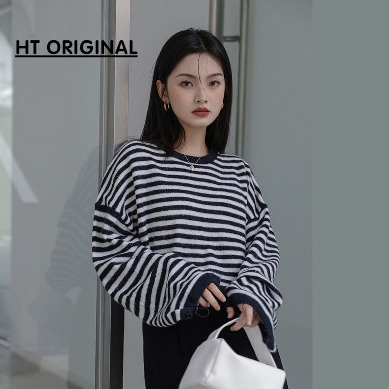 ブラックホワイトハイウェストウェストギャザースプリング秋物トップス ラウンドネックルーズカジュアルストライプニットTシャツレディース ロング 春物 オータム Oネック 長袖 ウエスト GroundMODE46940647129 | pleglad Ground