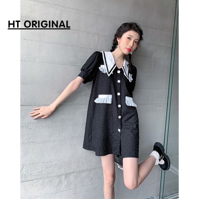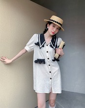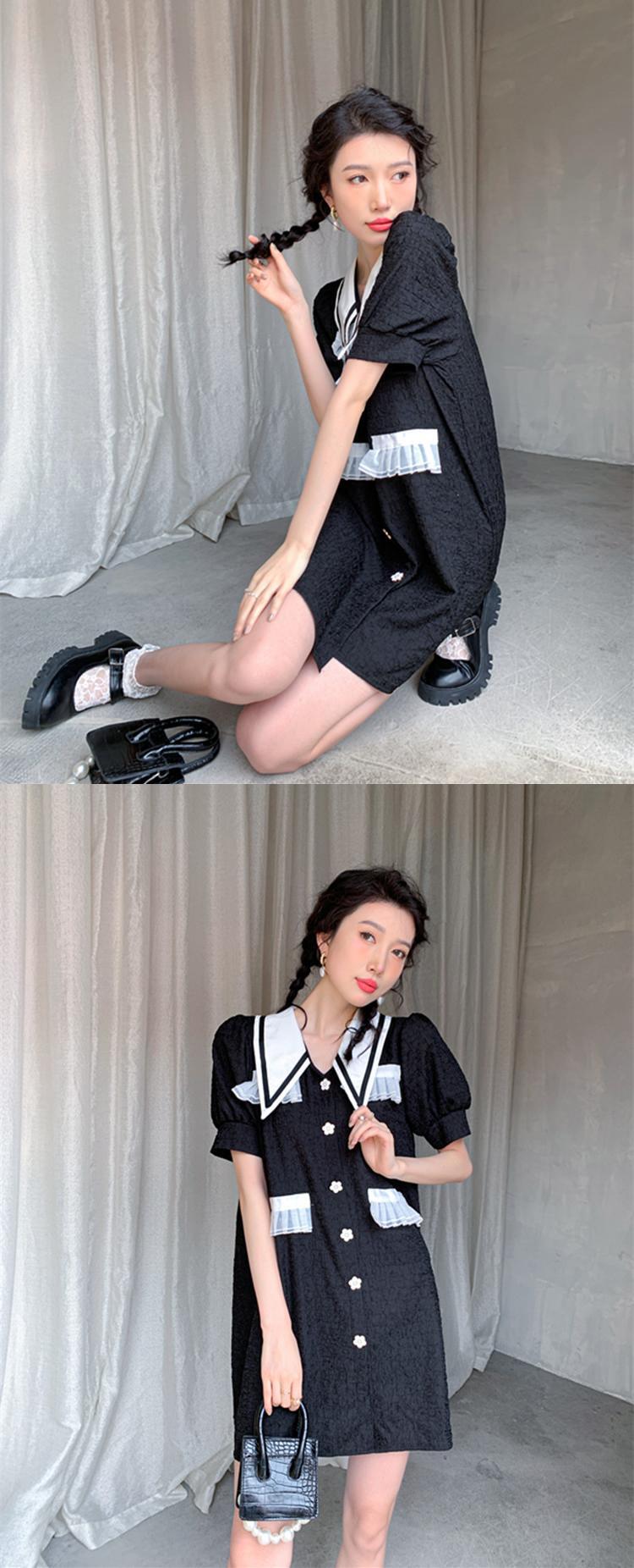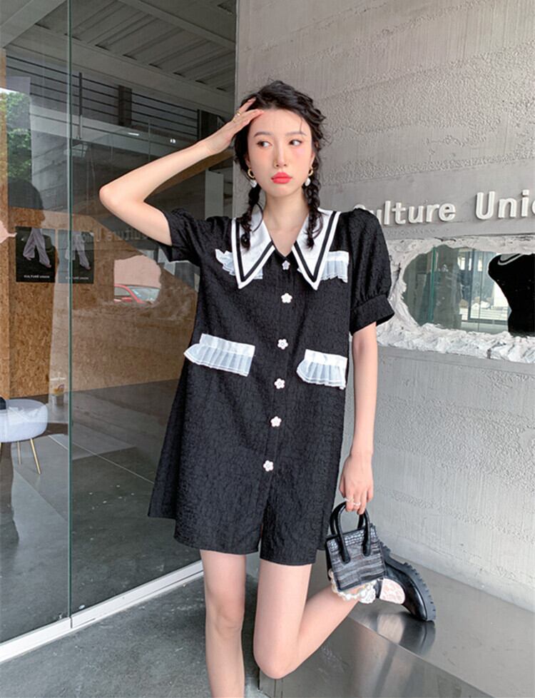 スタンダードスタイルブラックホワイトシャツ スカート Flowerデザイン ボタンワンピース夏服 レトロ 夏物 フラワーデザイン ミドル丈 GroundMODE463080381493 | pleglad Ground