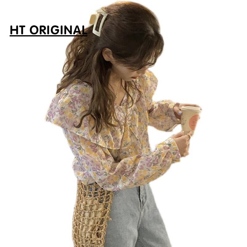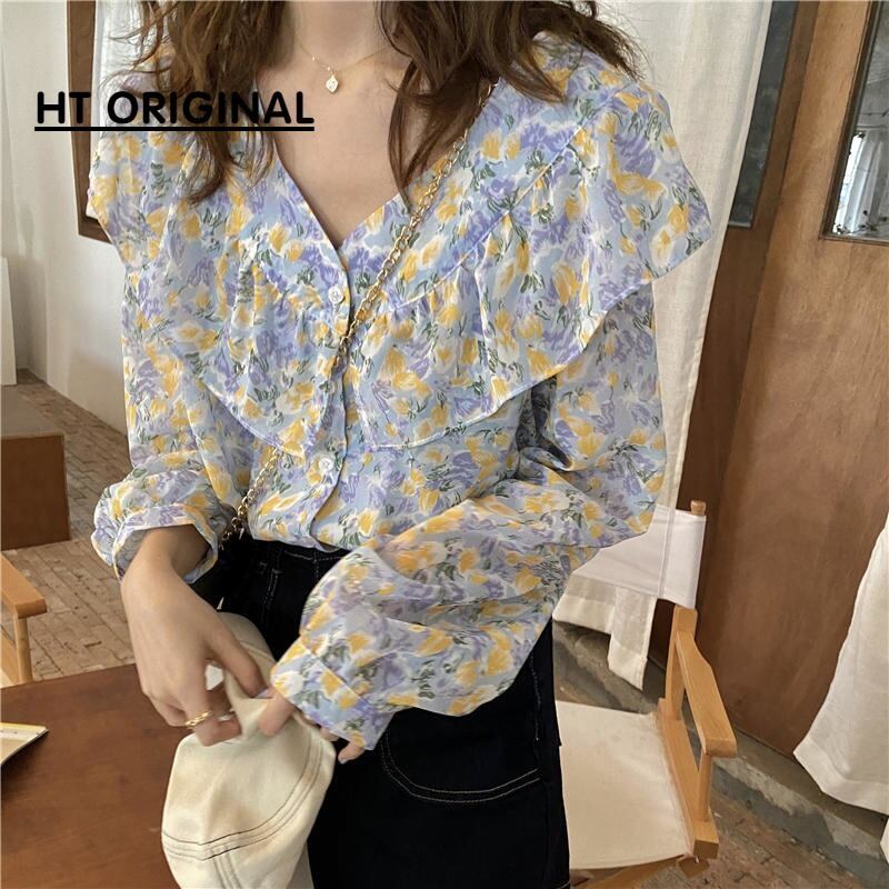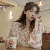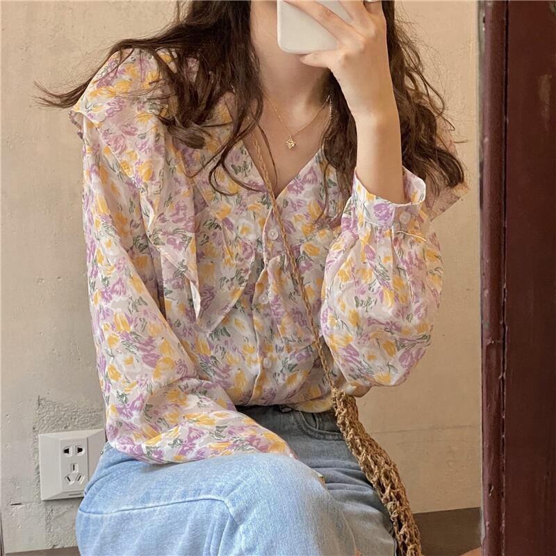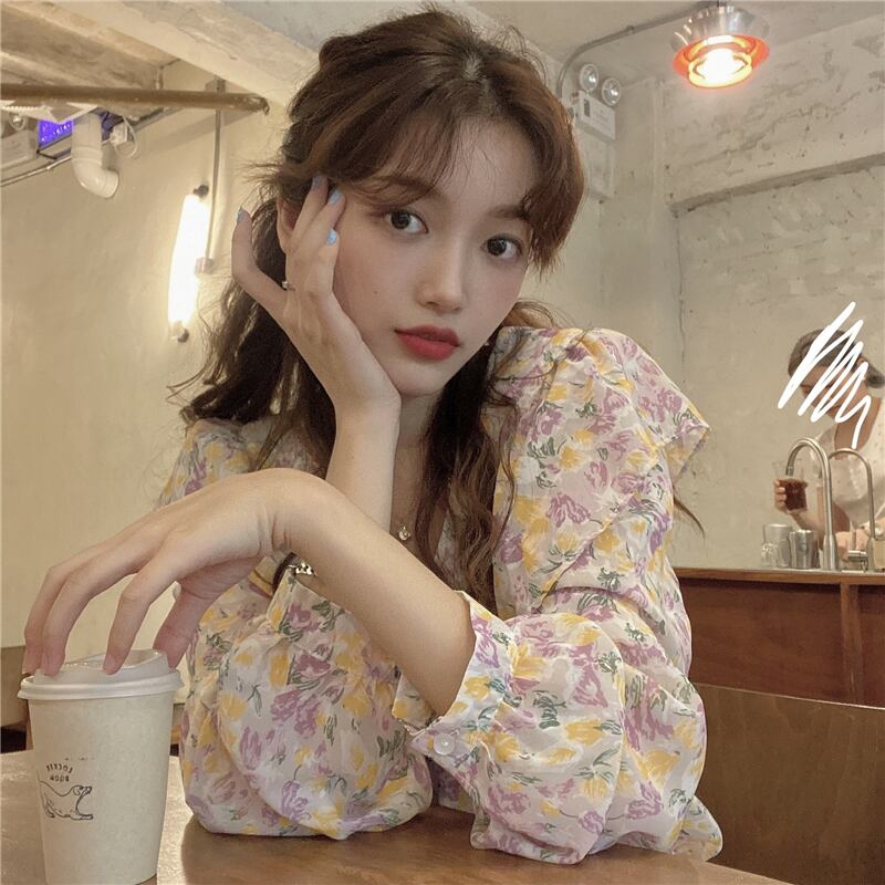 秋物韓国ファッションシャツ Vネックスタイルトップス フローラルシフォン夏服 ロング 大人ガーリー スウィート キュート カジュアル 夏物 オータム 花柄 長袖 GroundMODE472836882568 | pleglad Ground