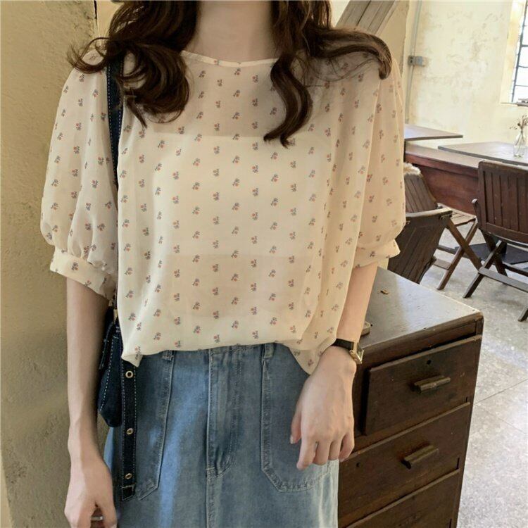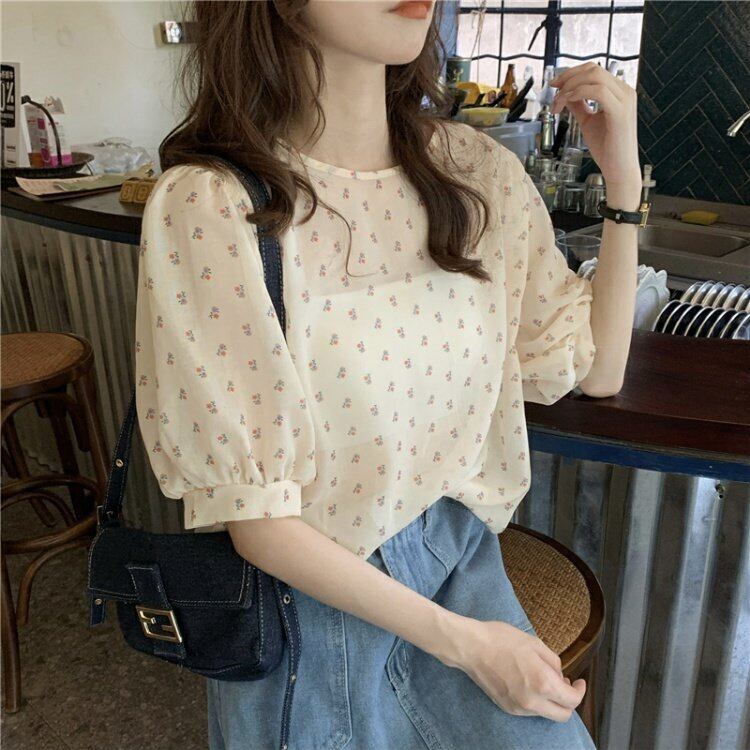 ルーズシフォンプリントトップス 韓国ファッションスタンダードラウンドネックフローラルスリーブシャツ レトロ 花柄 Oネック GroundMODE422371862699 | pleglad Ground