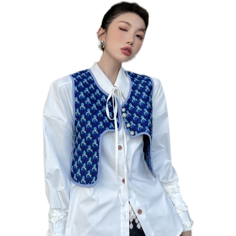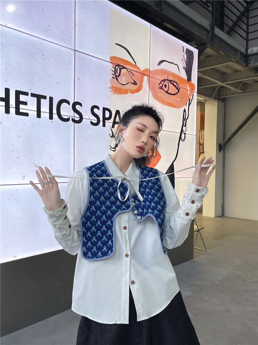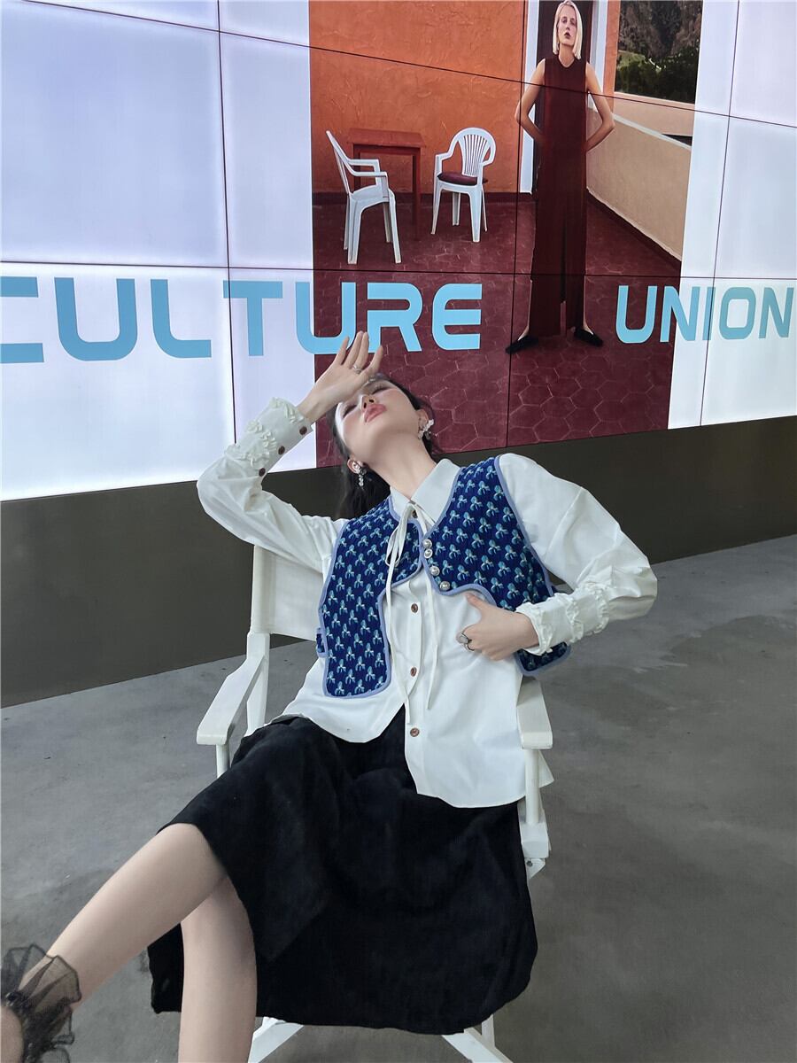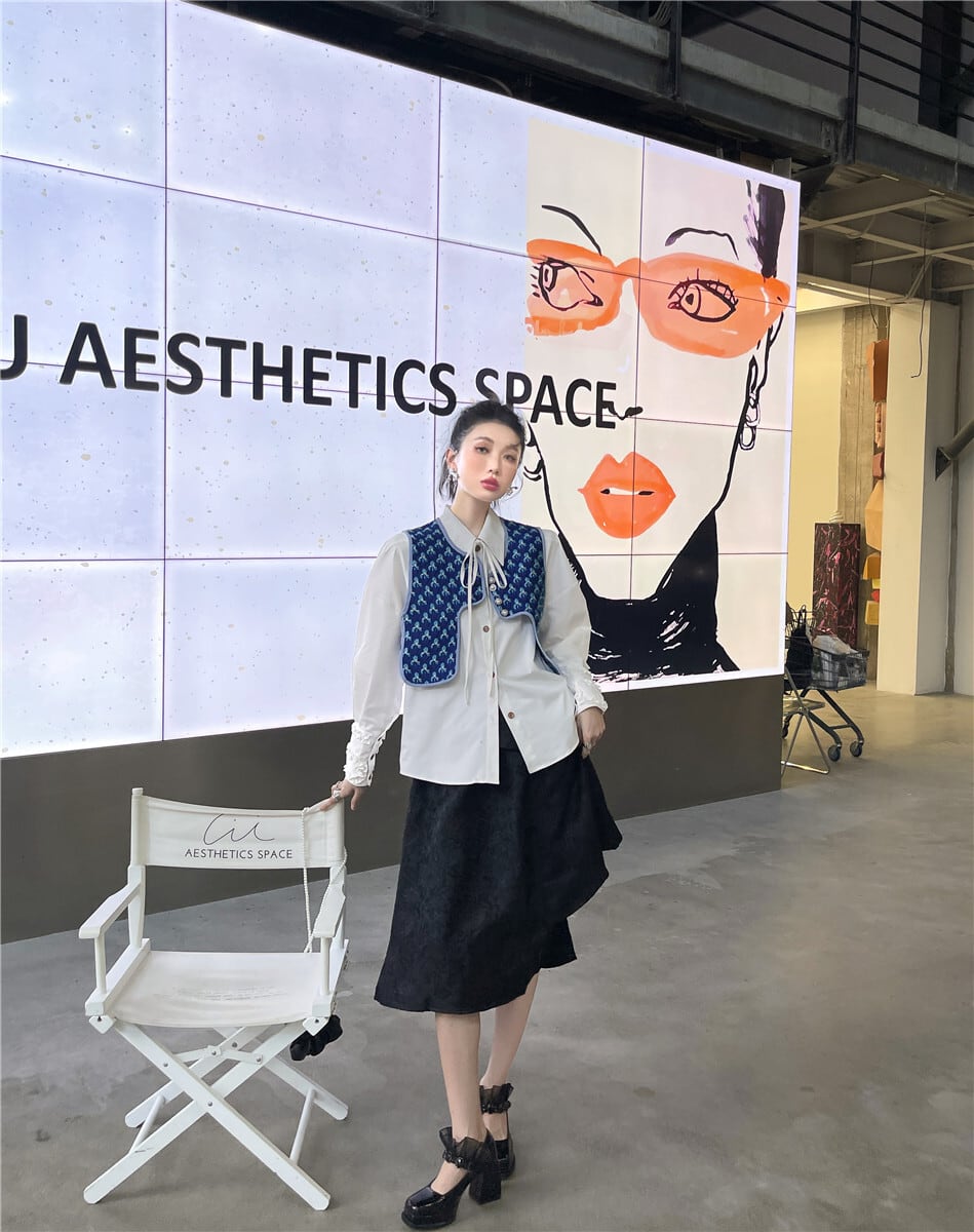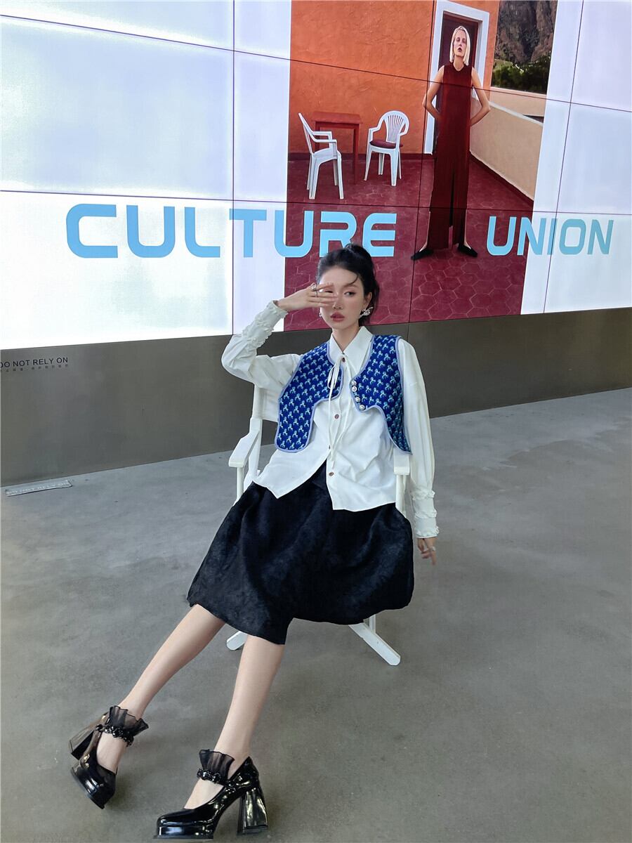 色:白のシャツ,ジャカードパールバックルベスト,ブラックジャカードスカート