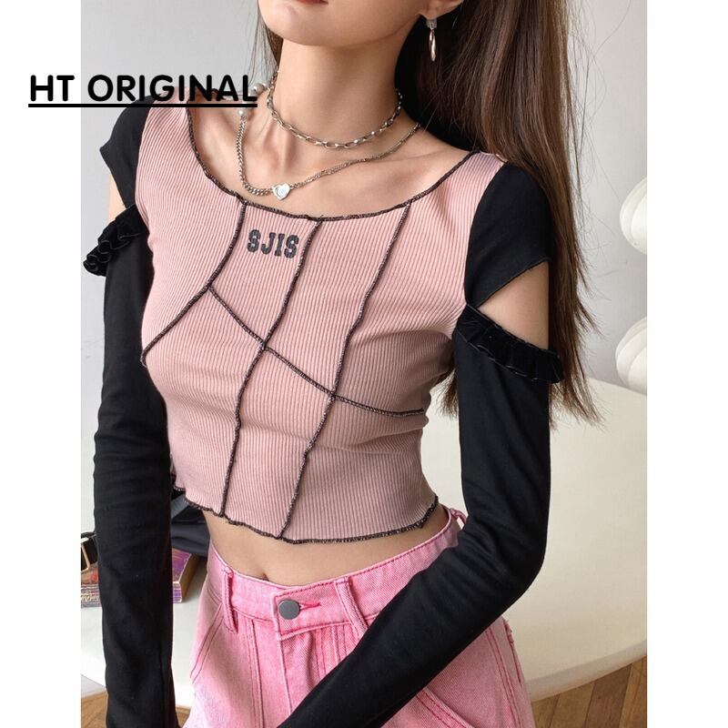 韓国ファッションスタンダードストラップレスカラーラウンドネックスリムショートTシャツNEWトップス ロング レトロ Oネック 長袖 GroundMODE474922539614 | pleglad Ground