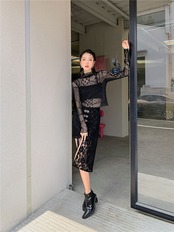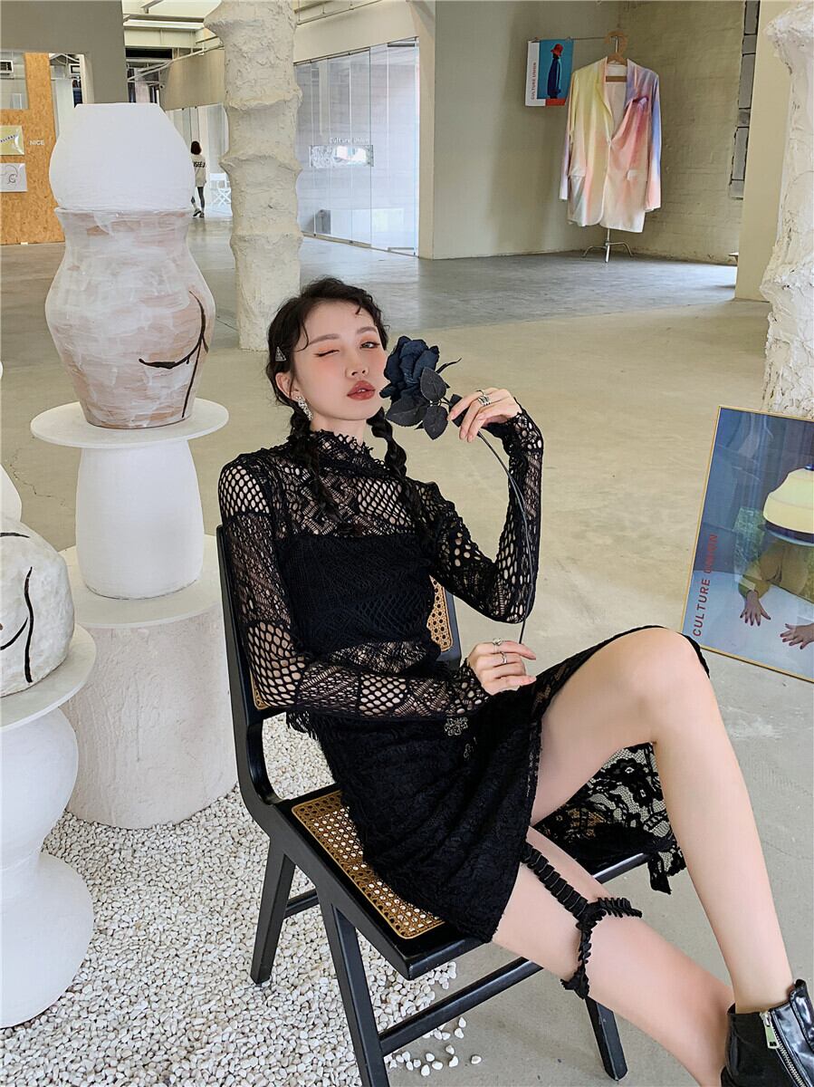 色:ブラックハーフタートルネックボトムシャツ,黒スカート,黒の非対称斜め前立てシャツ