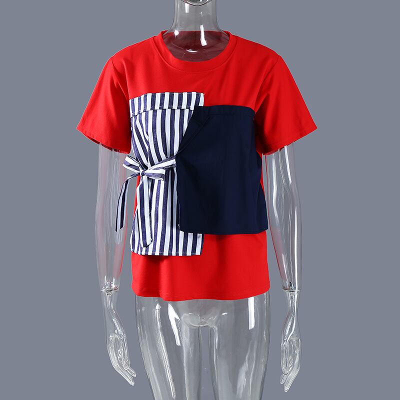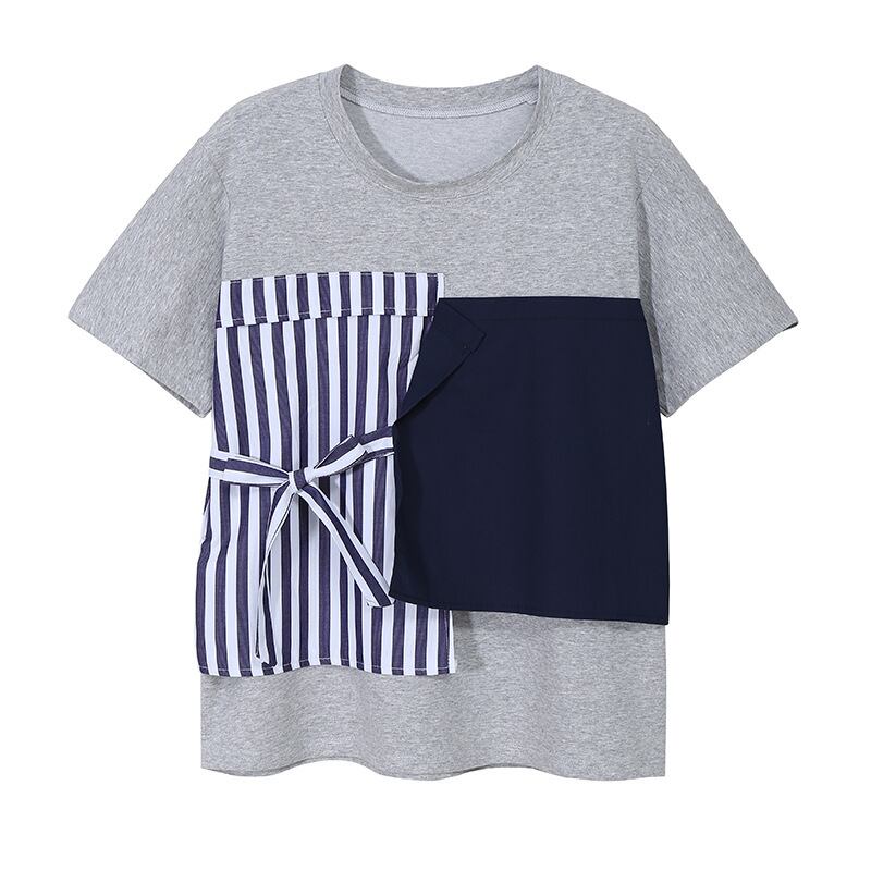 夏服ルーズショートリボンラウンドネックプルオーバー Tシャツレディーストップス 夏物 Oネック ステッチ GroundMODE88041242180