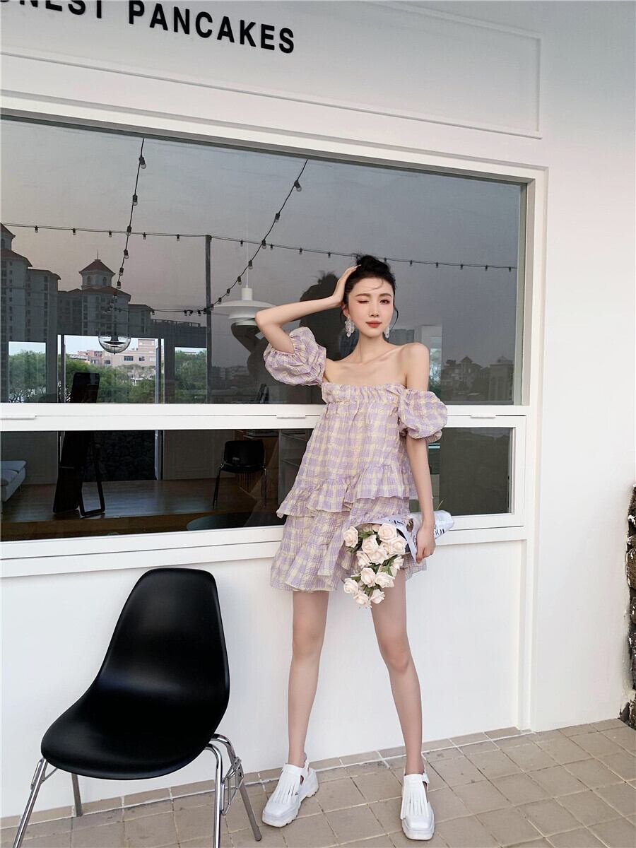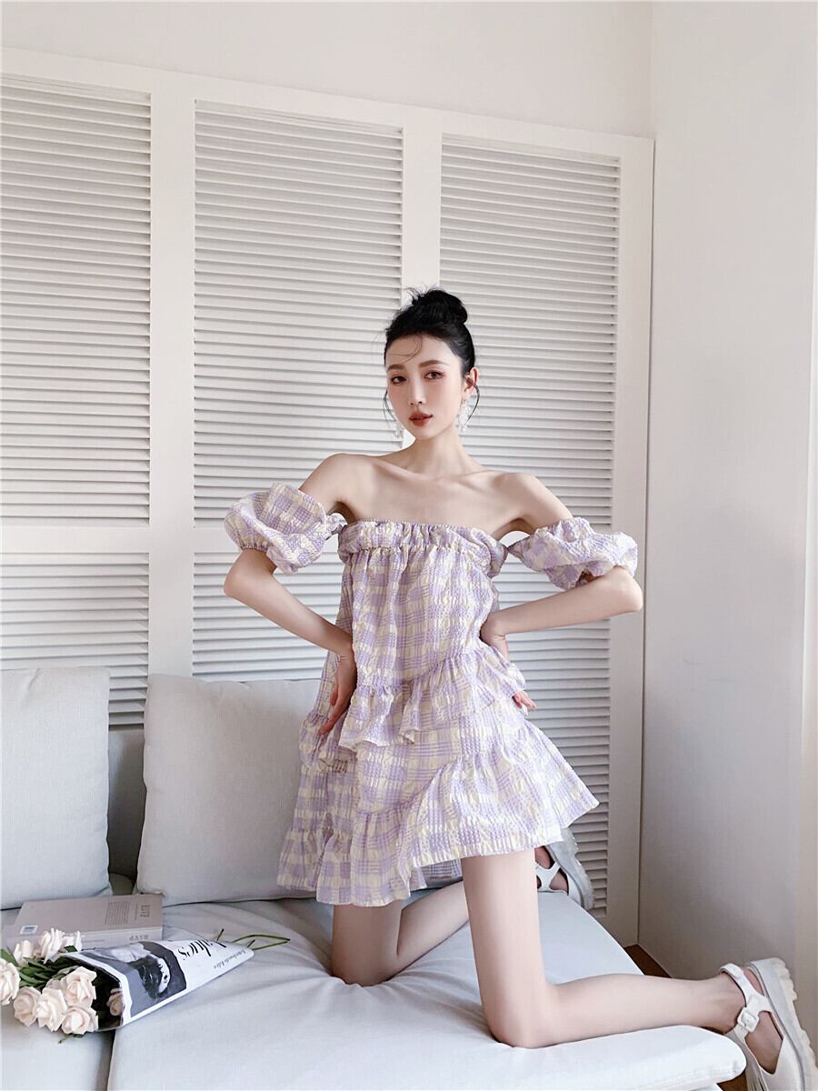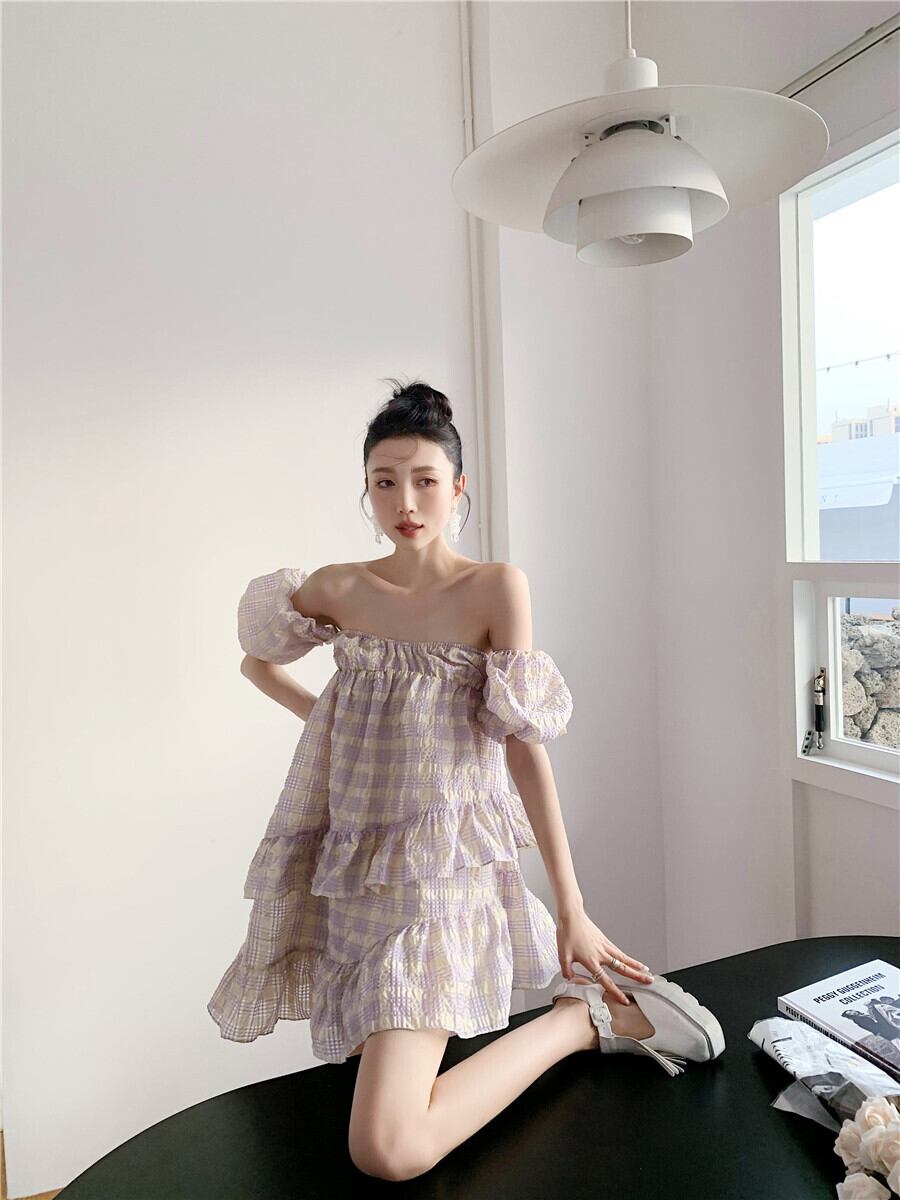 格子柄オフショルダーサイドスリーブワンピースレディース ランタンスリーブ 大人ガーリー スウィート キュート カジュアル パープル GroundMODE218165116419 | pleglad Ground