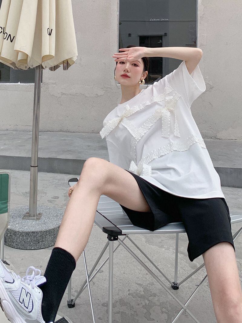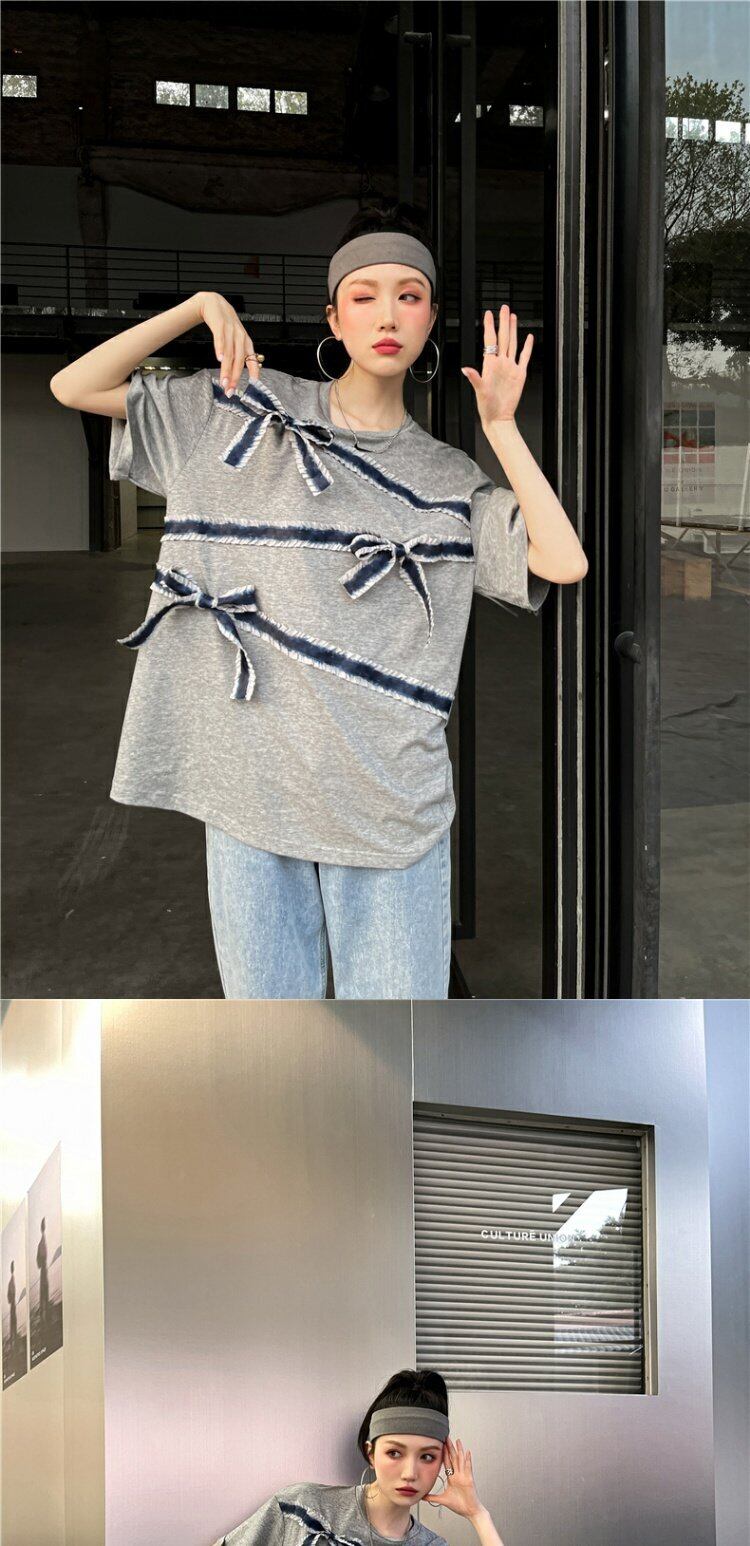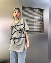 Flowerデザイン スプリング夏服リボンTシャツルーズ薄手ラウンドネック半袖スリーブ ショート ハーフスリーブ 大人ガーリー スウィート キュート カジュアル 春物 夏物 Oネック フラワーデザイン GroundMODE449994066610 | pleglad Ground