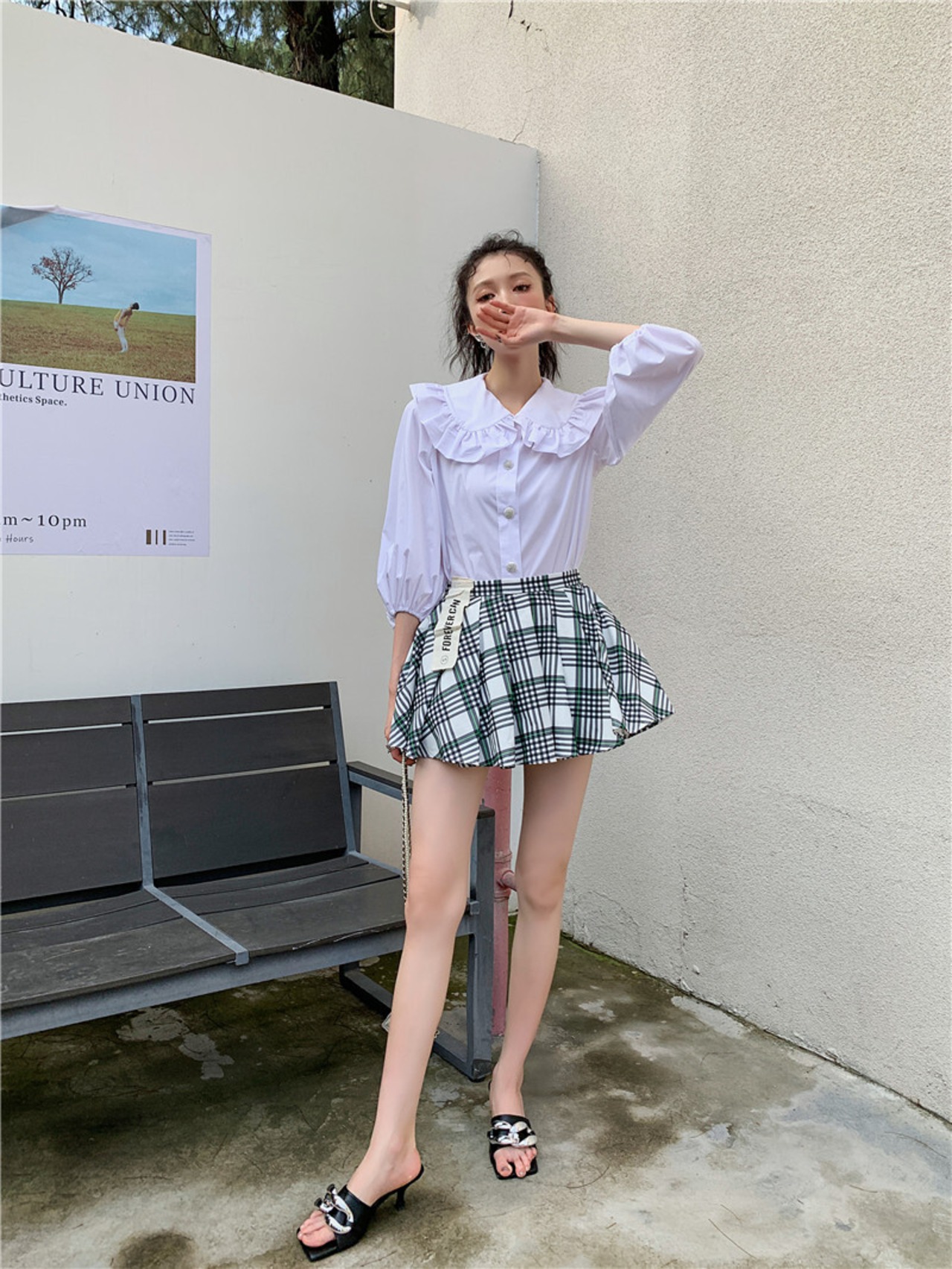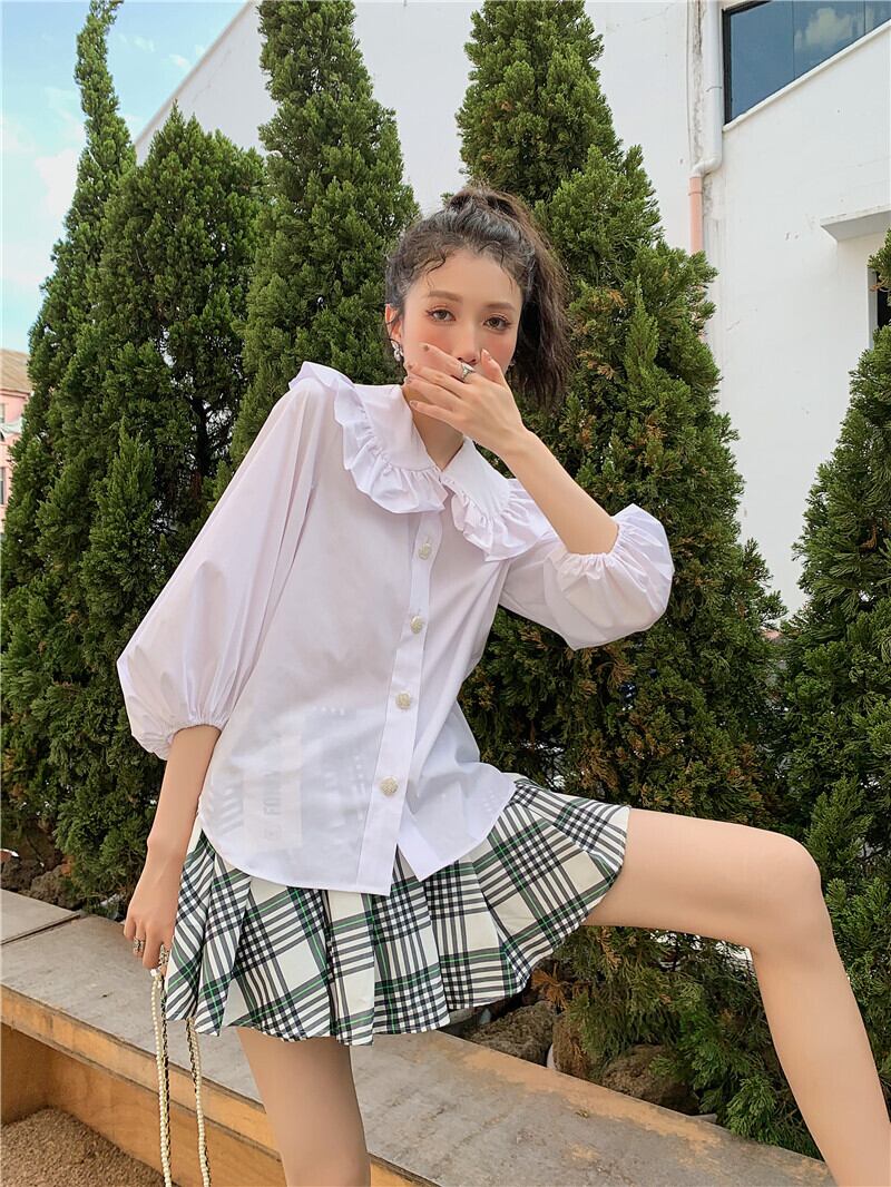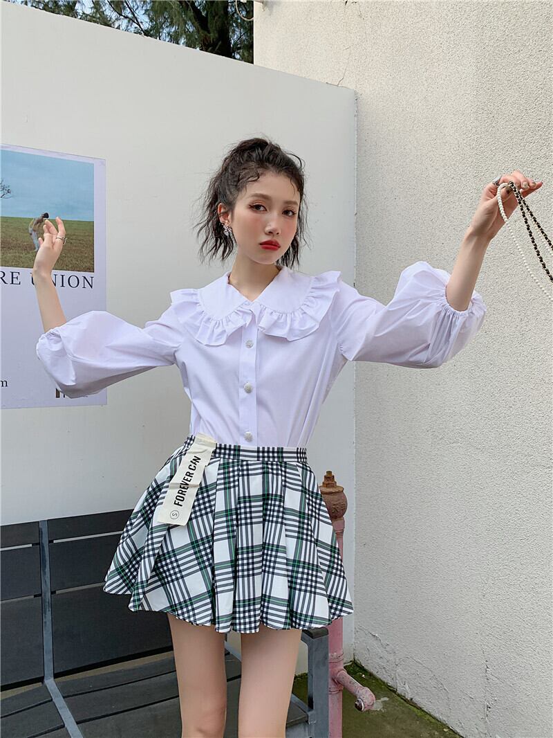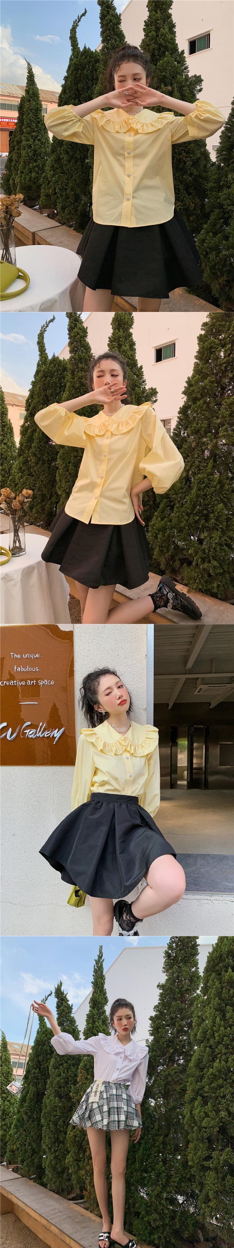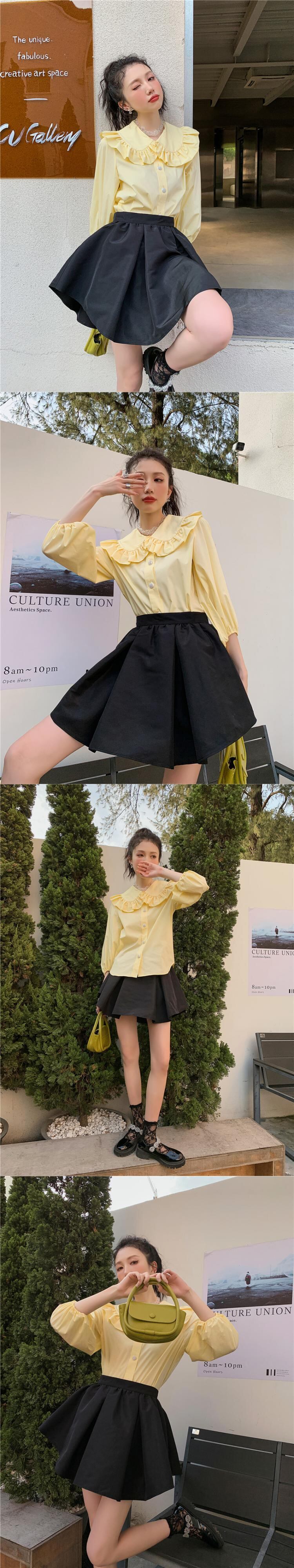 色:黒スカート,チェック柄スカート,黄色のシャツ,白のシャツ