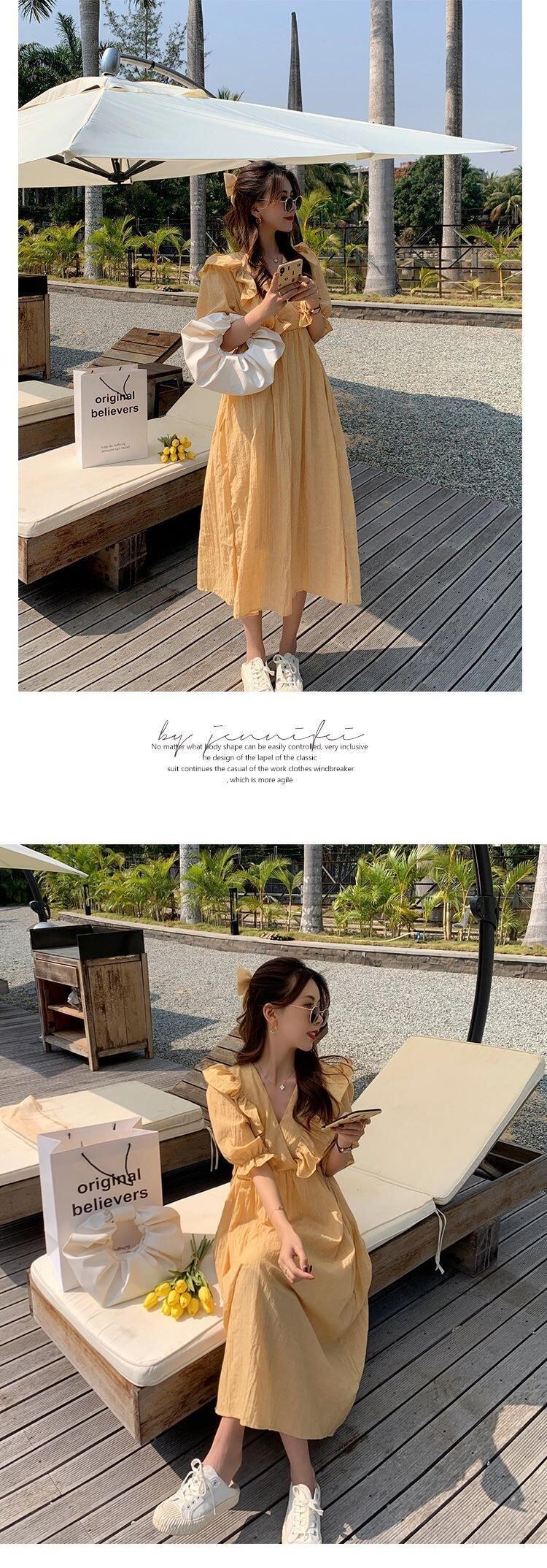 半袖スリーブワンピースイエローロングスカート ウェスト夏服スタイルレディース ショート コットン ハーフスリーブ 夏物 ウエスト GroundMODE429442097992 | pleglad Ground