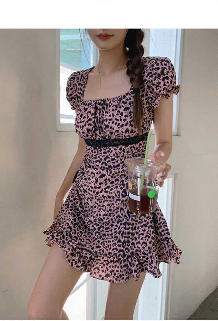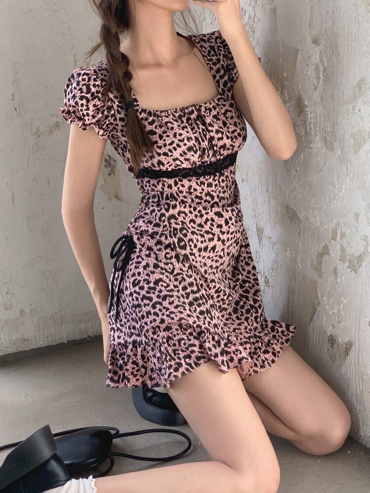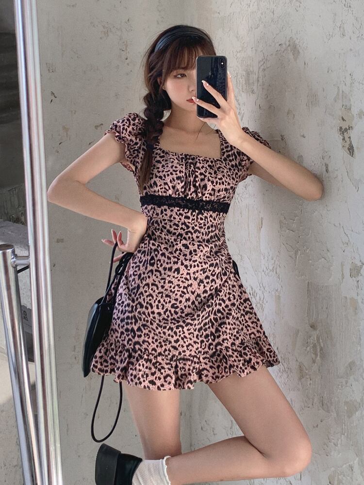 ブラックパウダーレオパードスリーブレースウェストワンピースレディース夏服 大人ガーリー スウィート キュート カジュアル 夏物 スクウェア ウエスト GroundMODE440227970515 | pleglad Ground