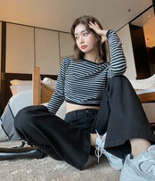 秋物ショートTシャツ韓国ファッション薄手ストライプハイウェストクロップトップ トップス ロング コットン オータム スタイル 長袖 ウエスト GroundMODE266455326516 | pleglad Ground