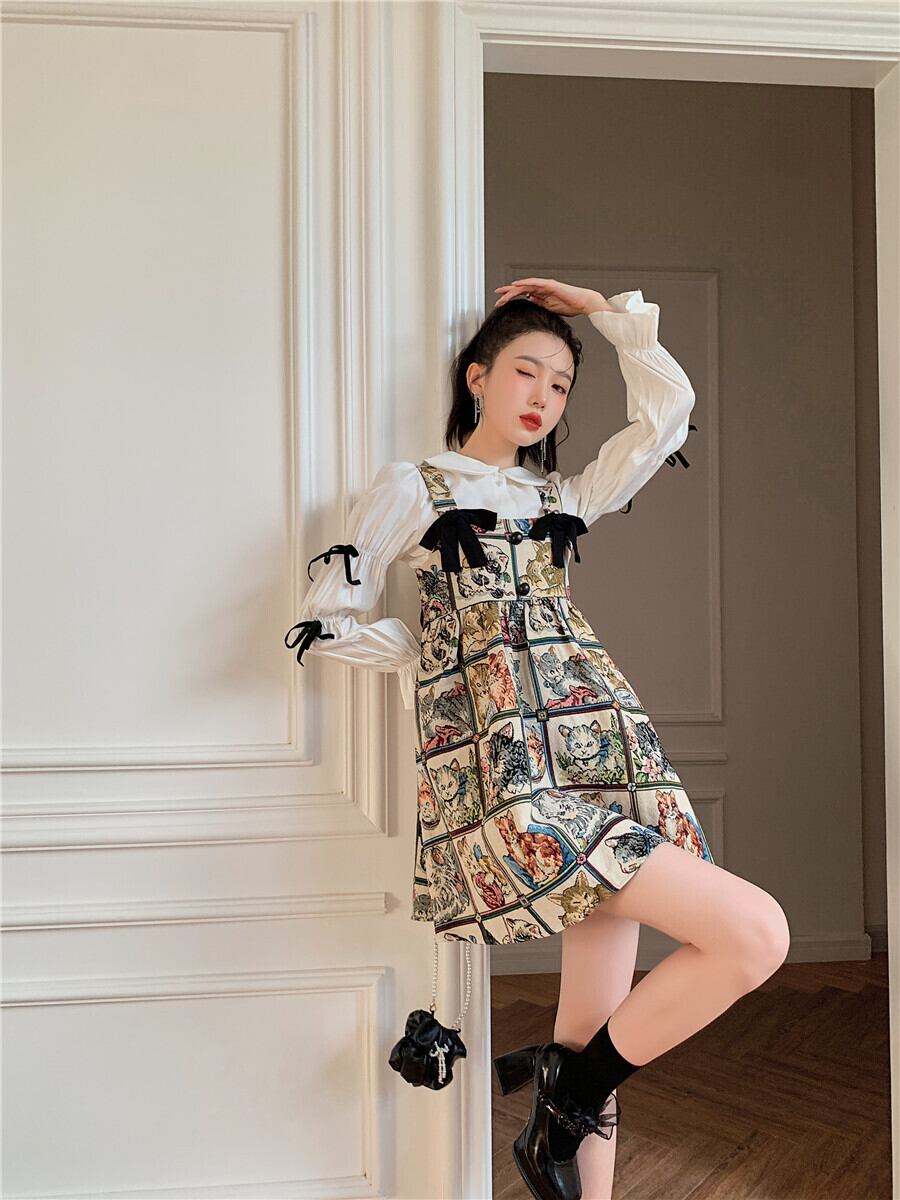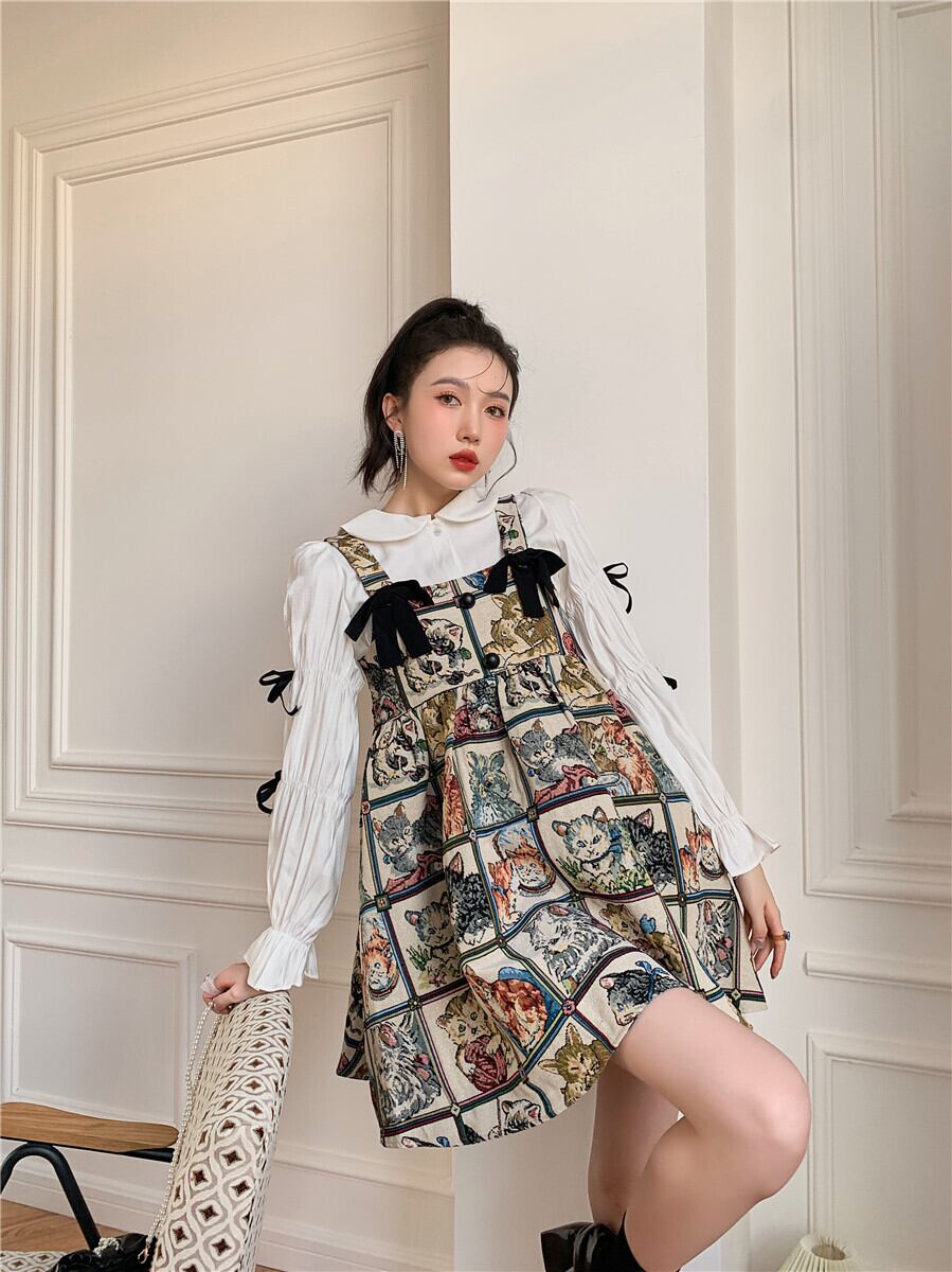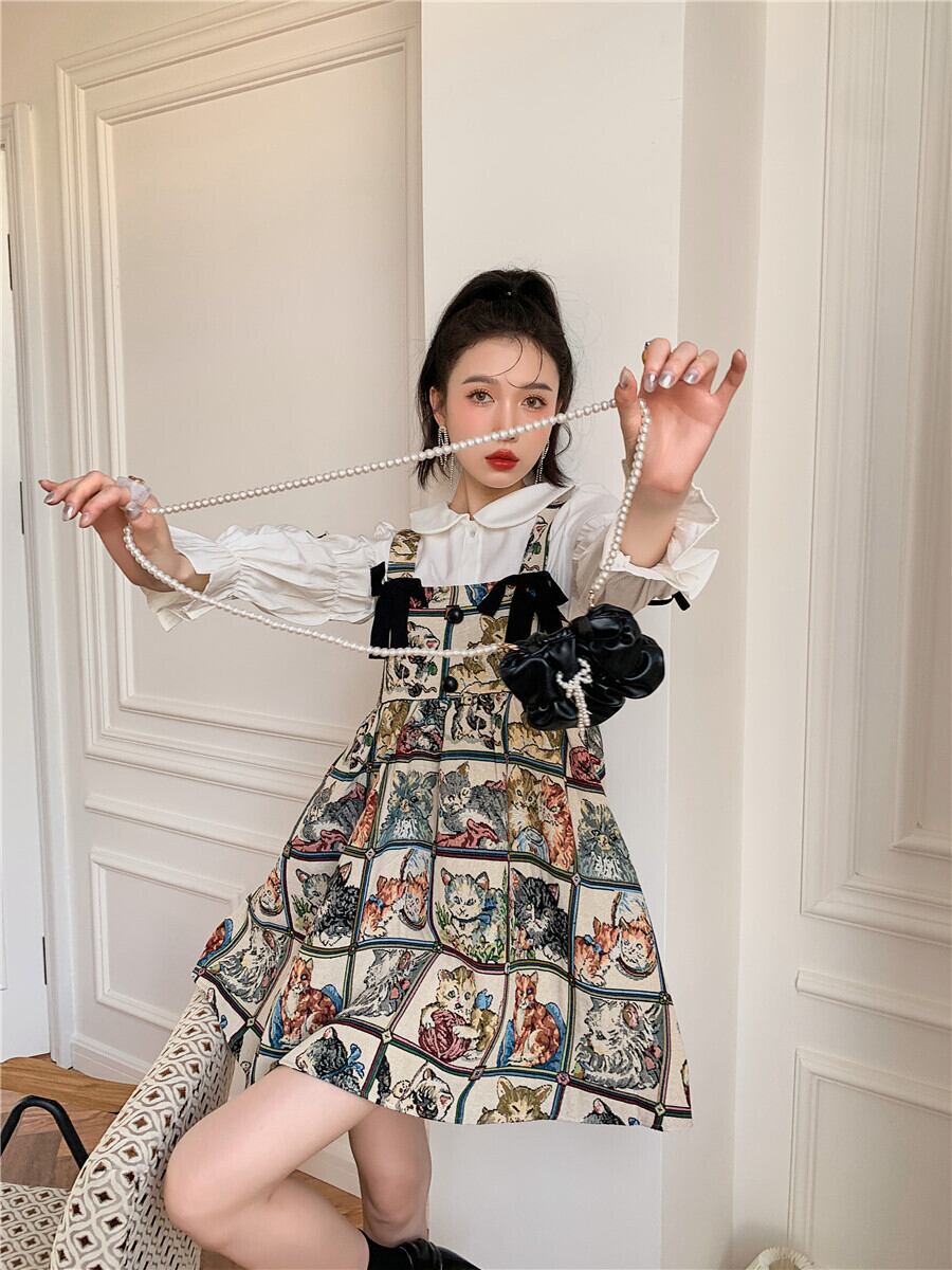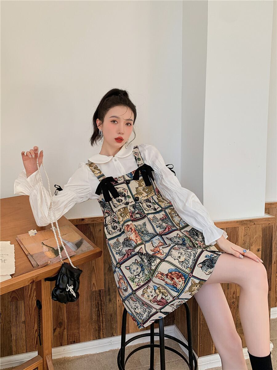 色:猫のサスペンダースカート,白い