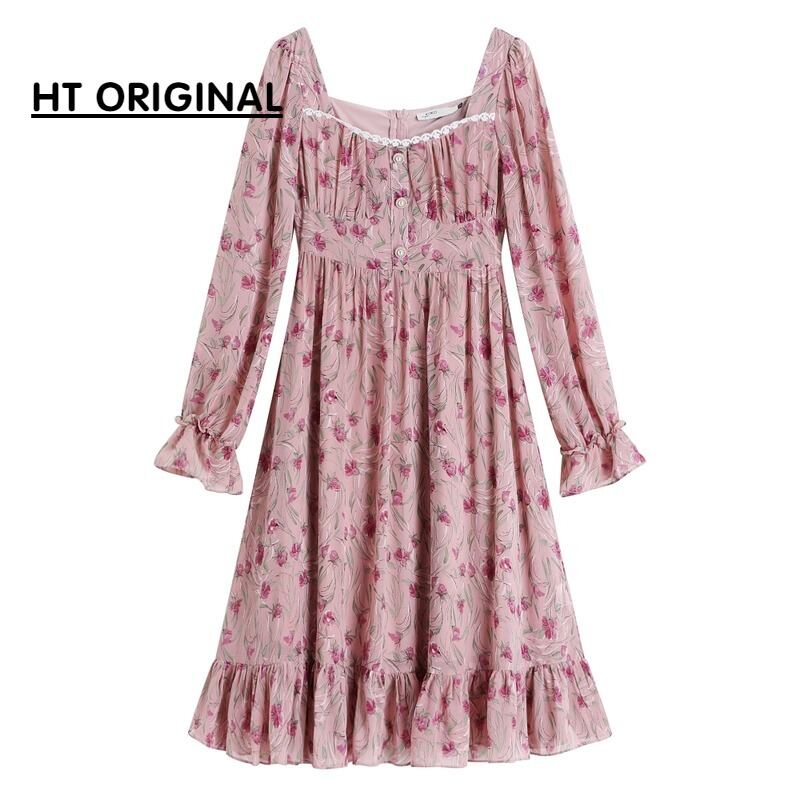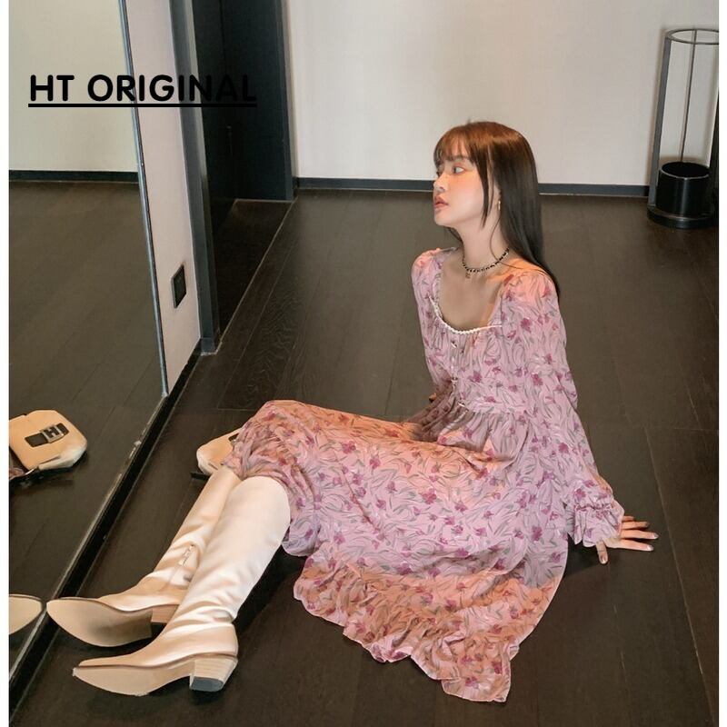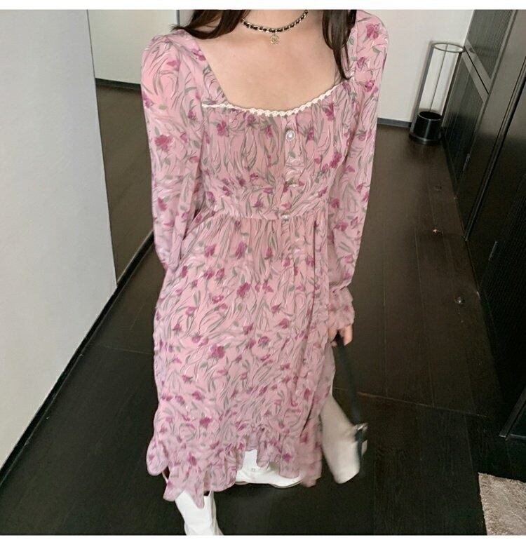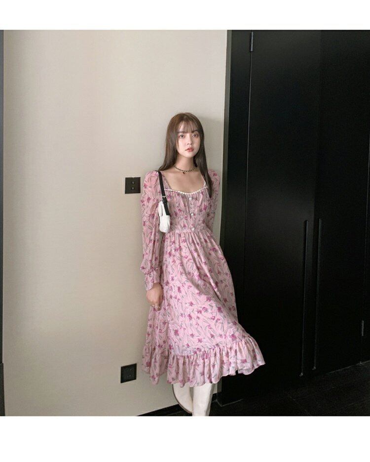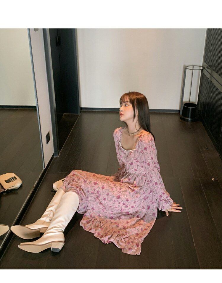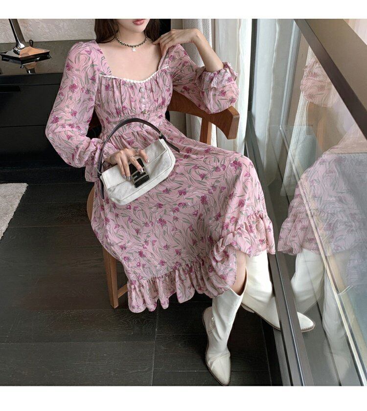 スプリングスタンダードカラーロングFlowerデザイン オレンジフローラルワンピース レトロ 春物 花柄 フラワーデザイン スクウェア GroundMODE415196271703 | pleglad Ground