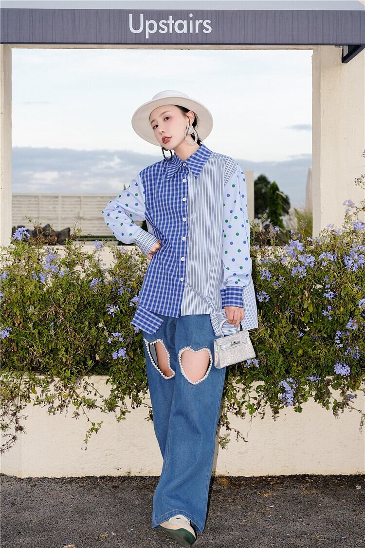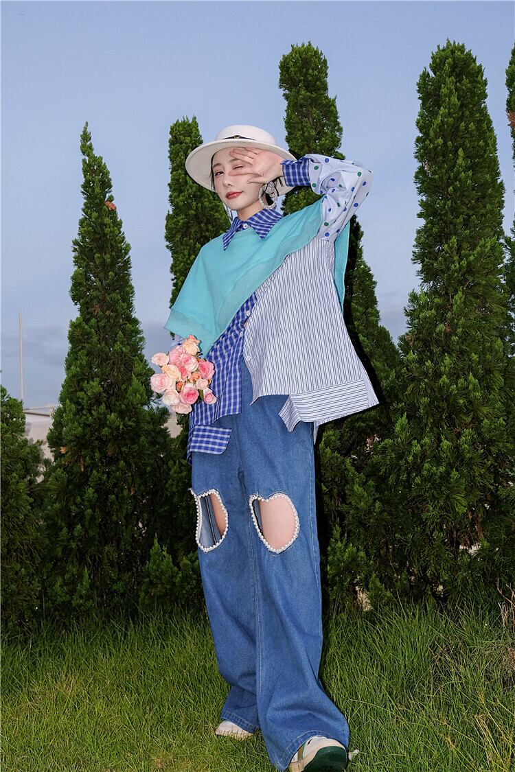 色:カラーブロックシャツ,デニムワイドレッグパンツ