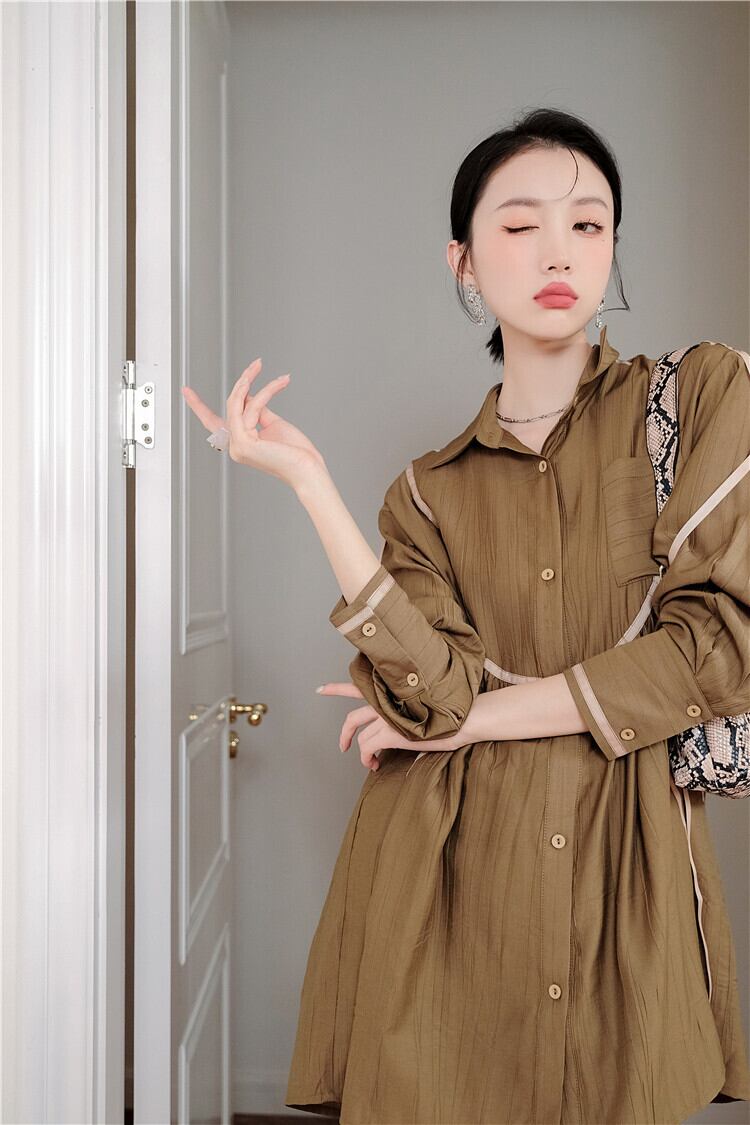 秋物スタンダードブラウングリーンシャツ レディースルーズ韓国ファッション ロング レトロ オータム ステッチ スタイル 長袖 GroundMODE243005925623 | pleglad Ground