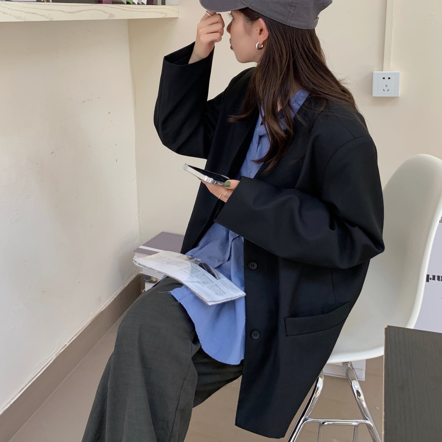 色:霧の青シャツスポット,黒のスーツジャケットスポット