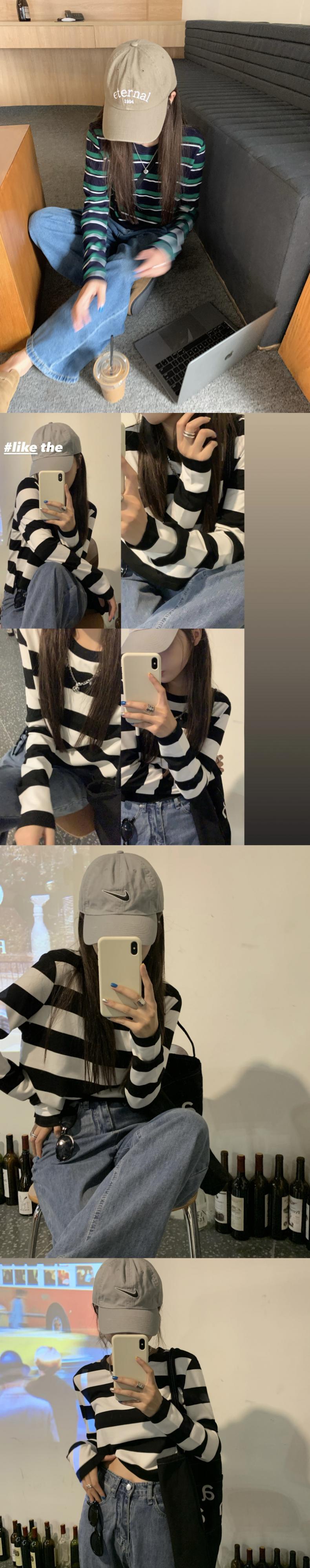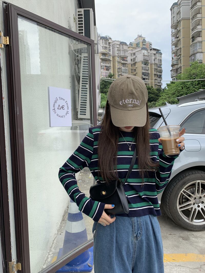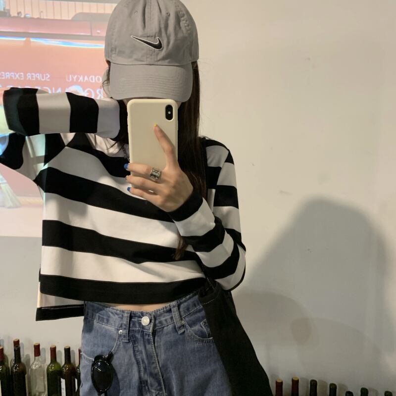 ルーズスタンダードグリーンストライプTシャツ秋物ラウンドネックブラックホワイトショートトップス レトロ オータム Oネック GroundMODE464240547154 | pleglad Ground
