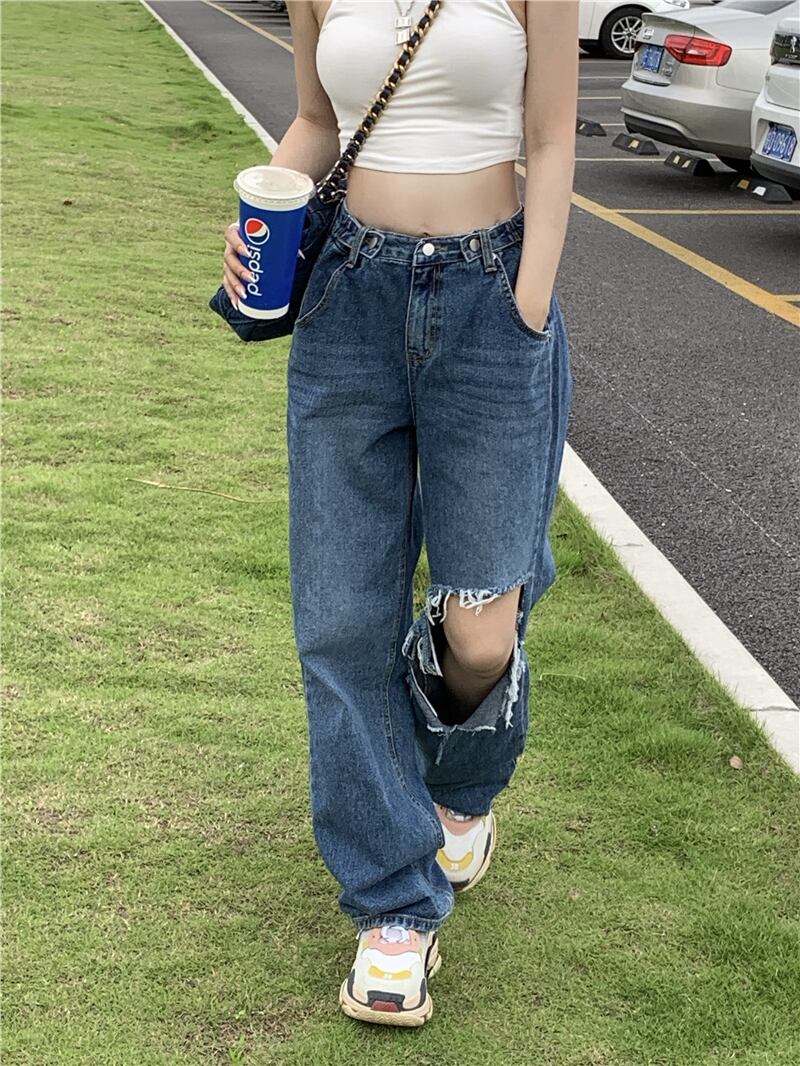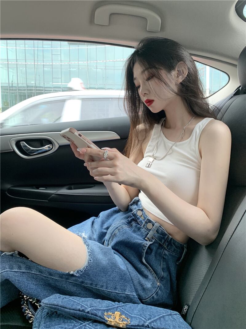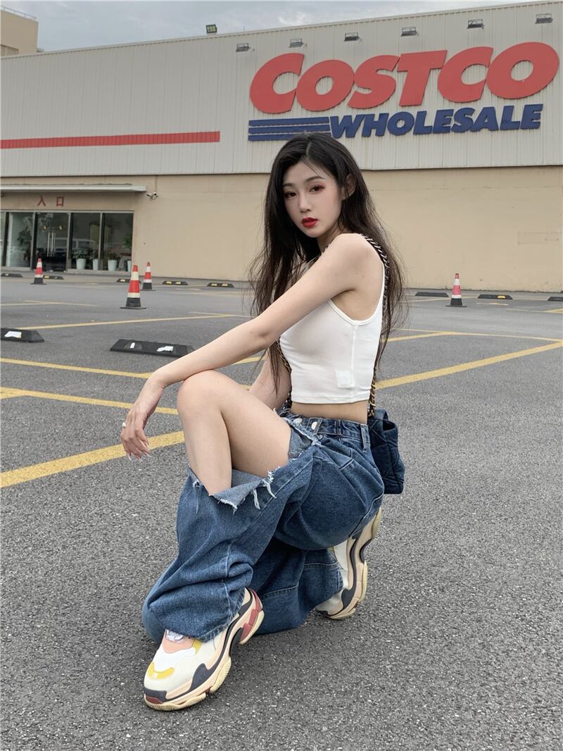 色:ホワイトサスペンダー,ダークブルージーンズ