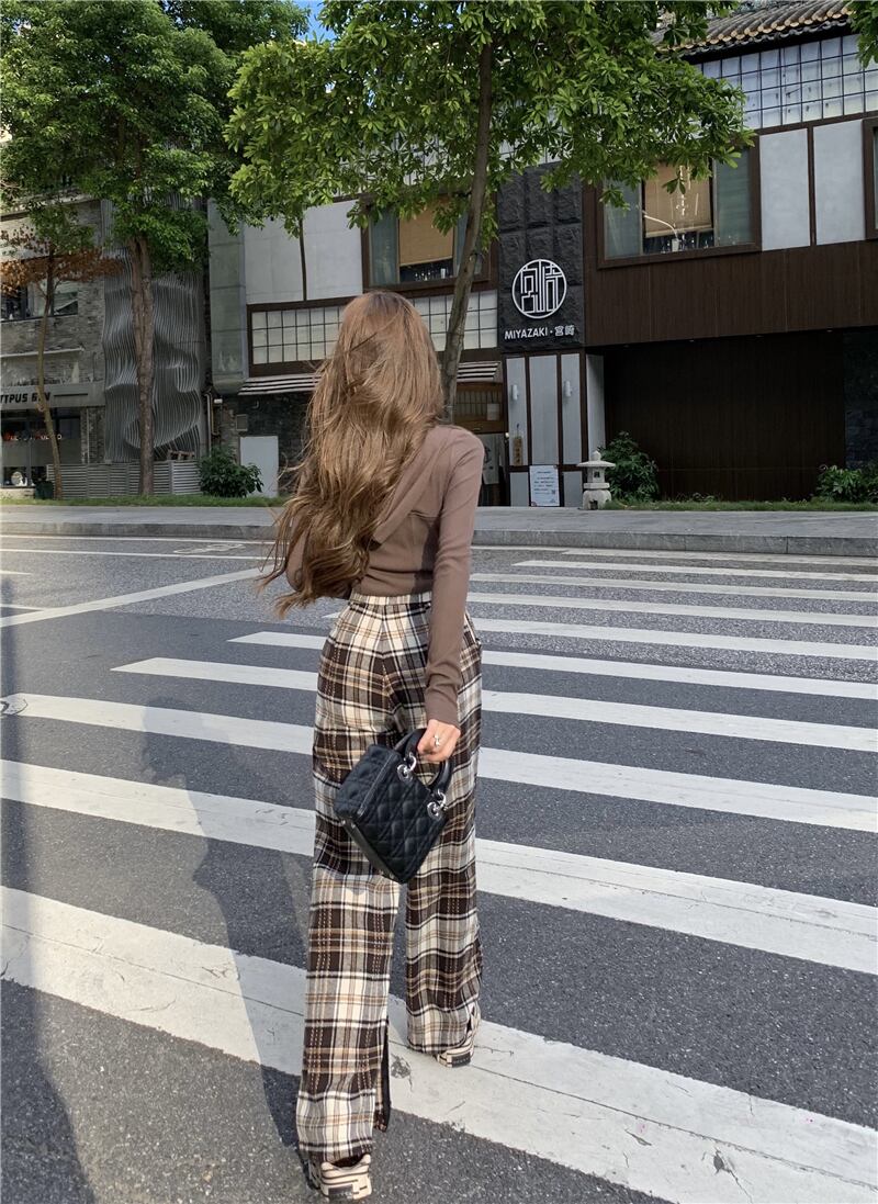 色:コーヒーカラーのトップスポット,チェック柄パンツ在庫あり