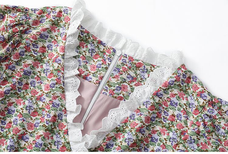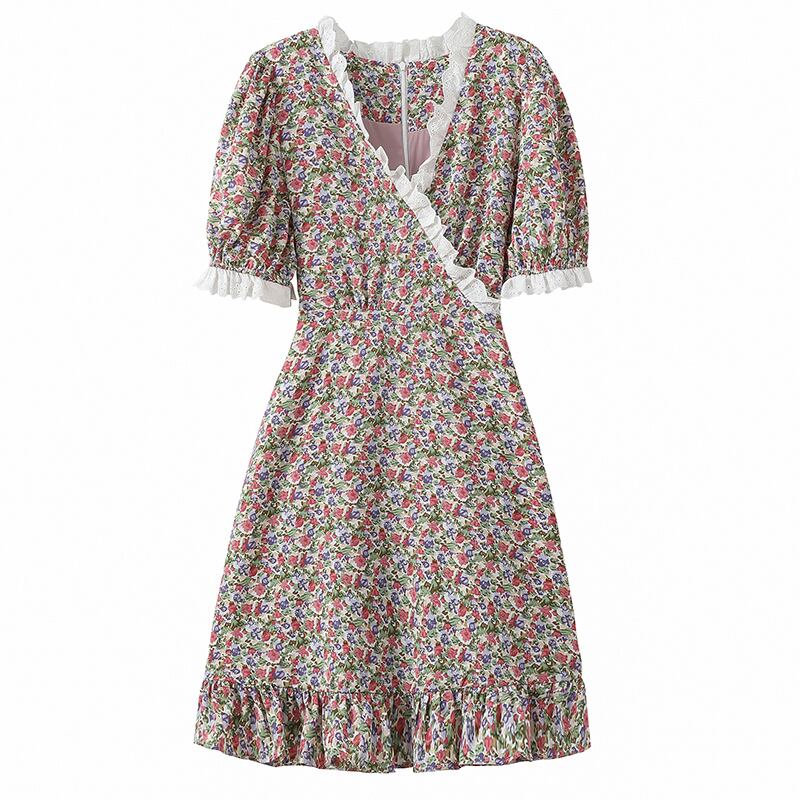 夏服Vネックフローラルミニ ワンピースワンピーススタンダードスリムウェストラッフルスカート ショート レトロ 夏物 花柄 ウエスト GroundMODE492387144336 | pleglad Ground