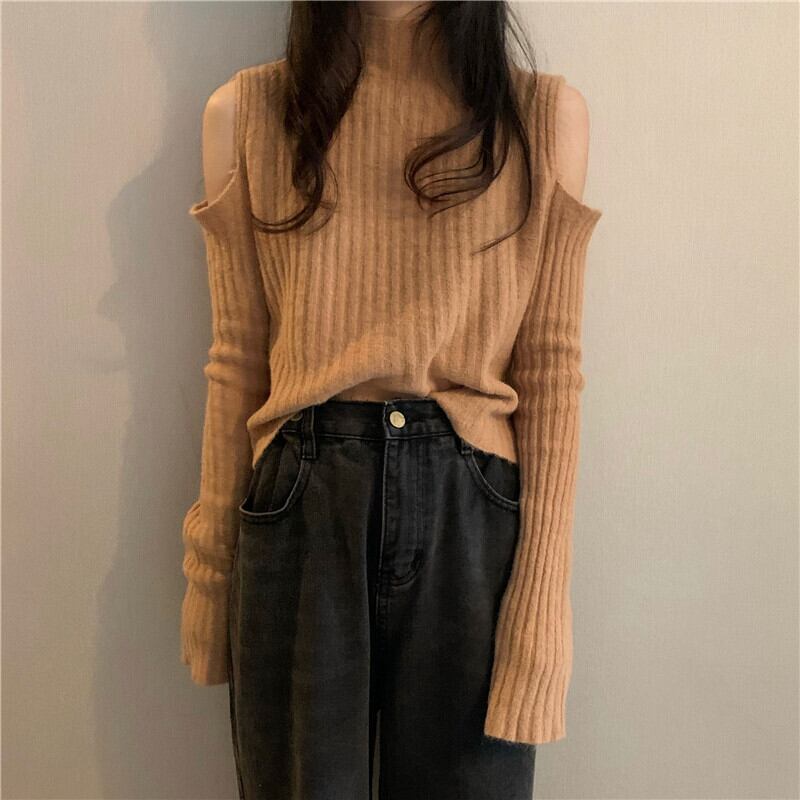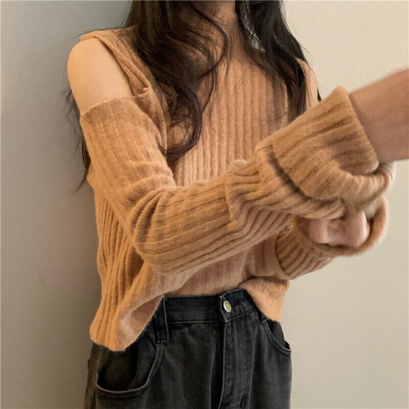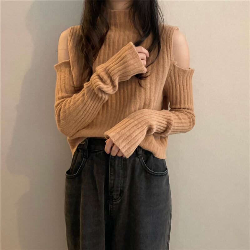 カラーニット秋物ウィンターソリッド ストライプゆったりトップス ロング オータム 冬物 オフショルダー ソリッドカラー 長袖 GroundMODE450080119506 | pleglad Ground