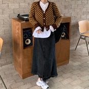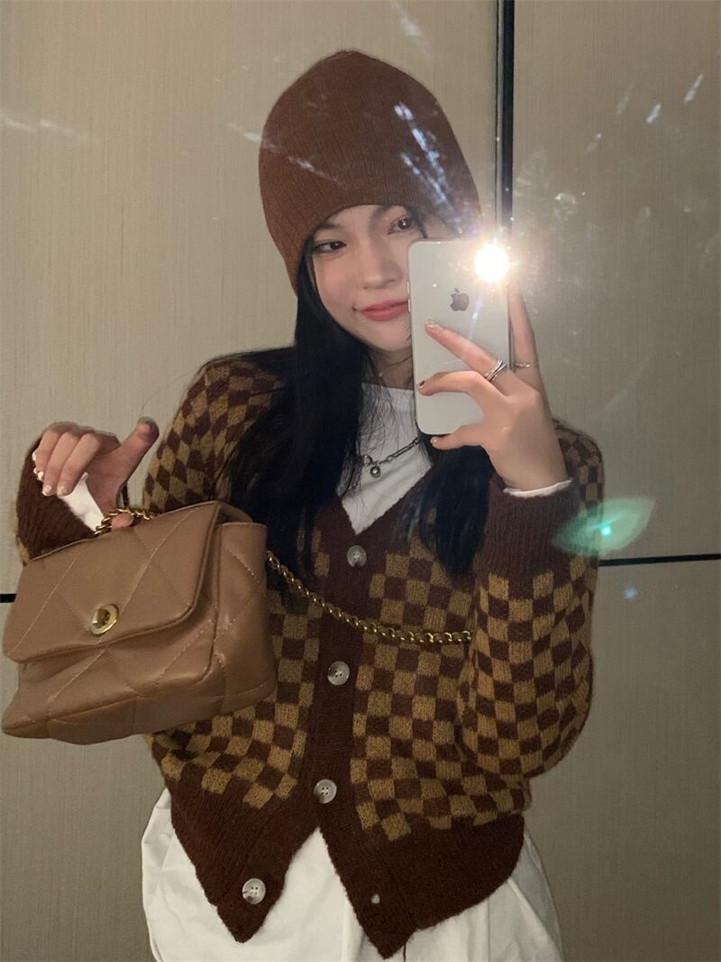 スタンダードVネックニットカーディガンジャケット スプリング秋物カラー格子柄ショートセーター ロング レトロ 春物 オータム 長袖 GroundMODE412632547888 | pleglad Ground