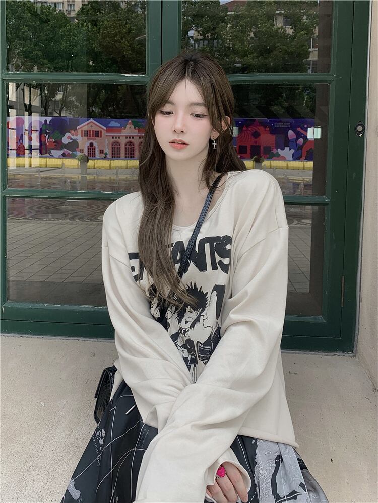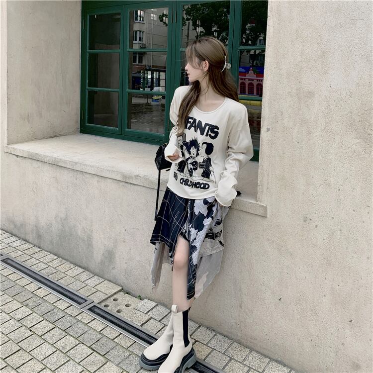 スタンダードプリントTシャツ秋物セーター ラウンドネックルーズトップス スカート ロング レトロ オータム Oネック 長袖 GroundMODE459274718301 | pleglad Ground