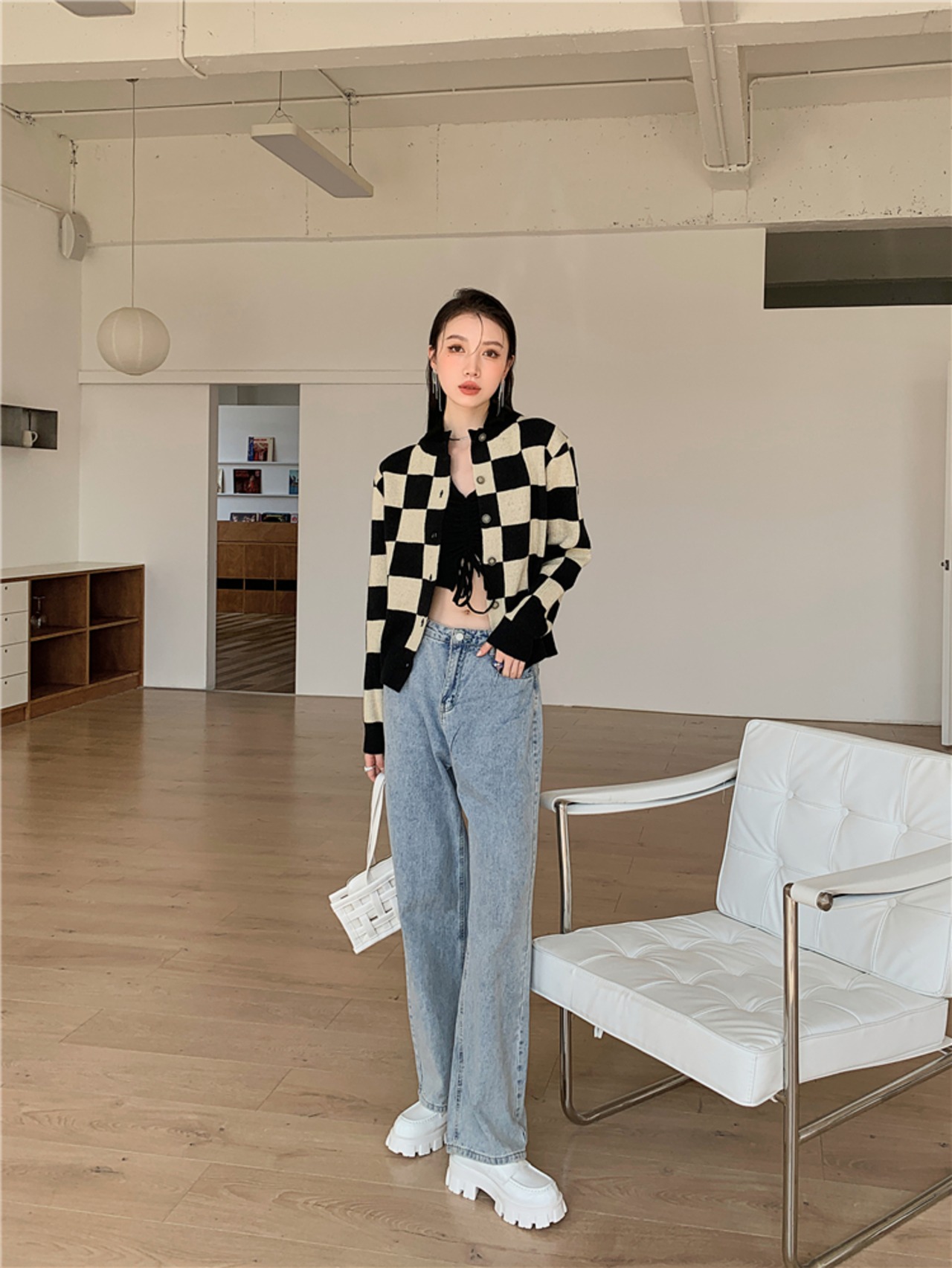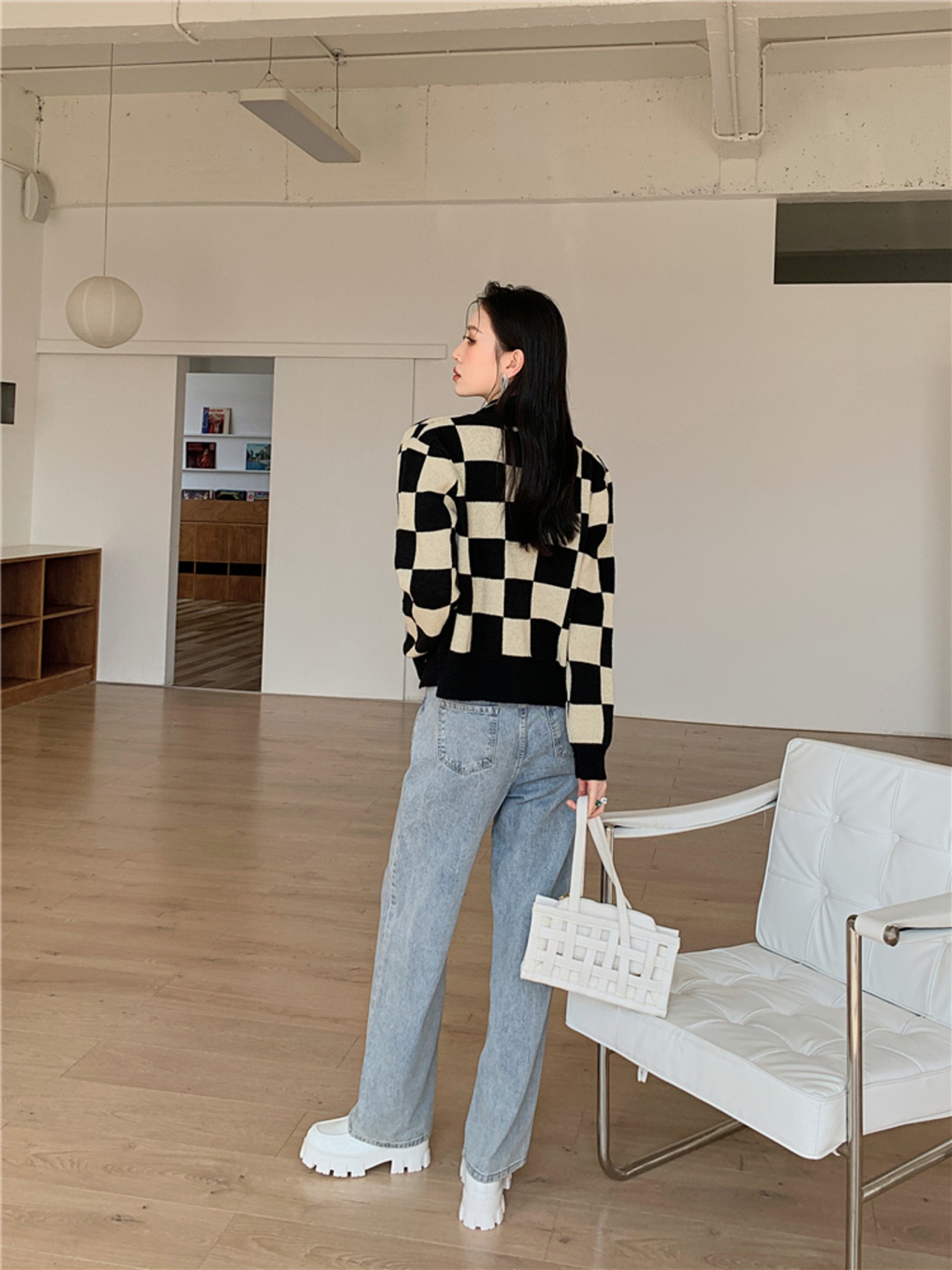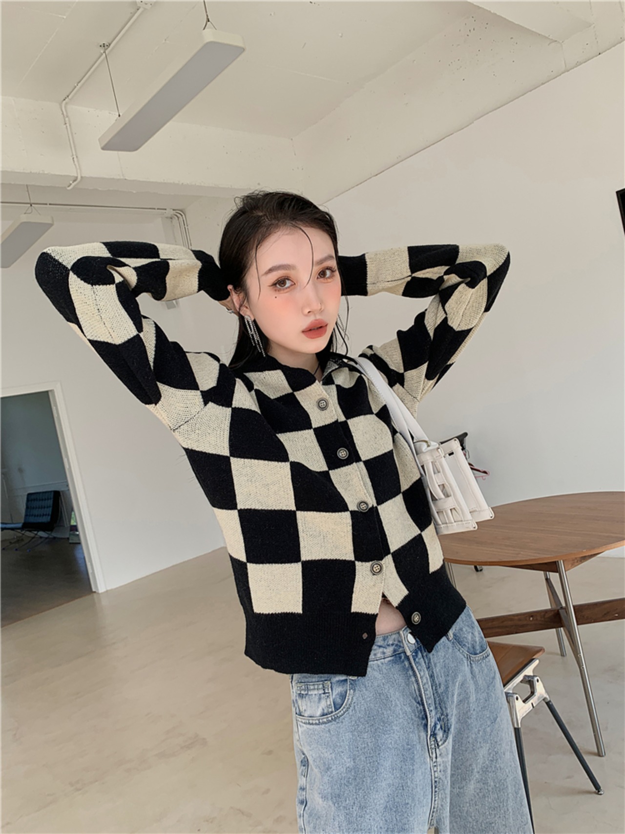 スプリング秋物格子柄ニットセーター 長袖スリーブ韓国ファッショントップス カーディガンジャケット ロング 春物 オータム GroundMODE468829356724 | pleglad Ground