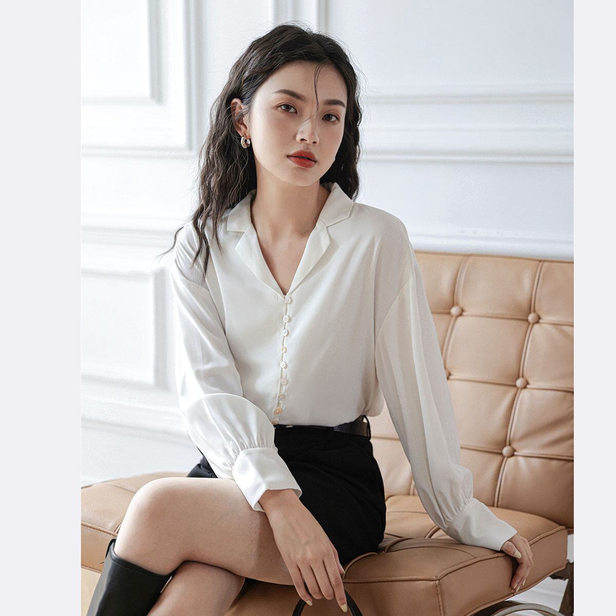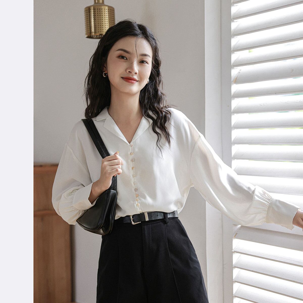 ルーズスタンダードスリーブカラーホワイトシャツ 秋物トップス レディース ロング ランタンスリーブ レトロ オータム 長袖 GroundMODE472718907500 | pleglad Ground