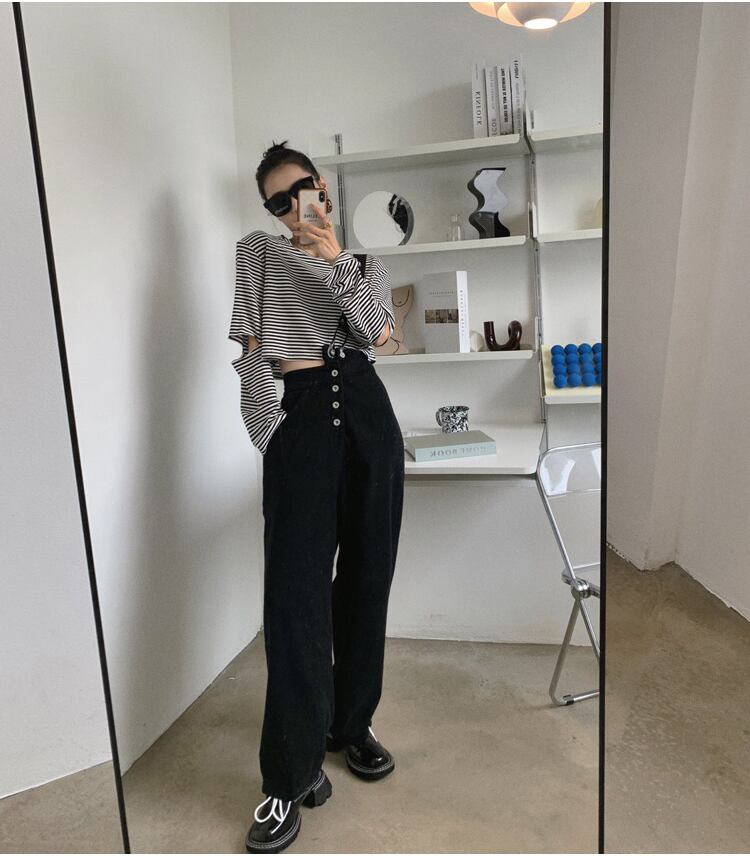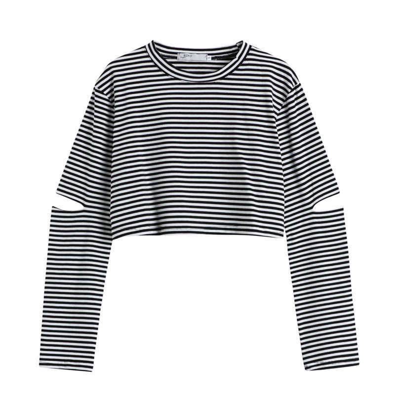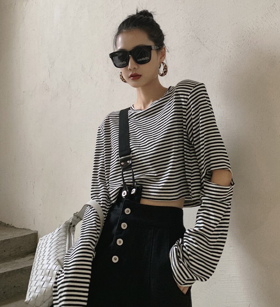 ストライプTシャツラウンドネックルーズハイウェストウェストショートクロップトップ トップス パンツ ロング Oネック 長袖 ウエスト GroundMODE445349404166 | pleglad Ground