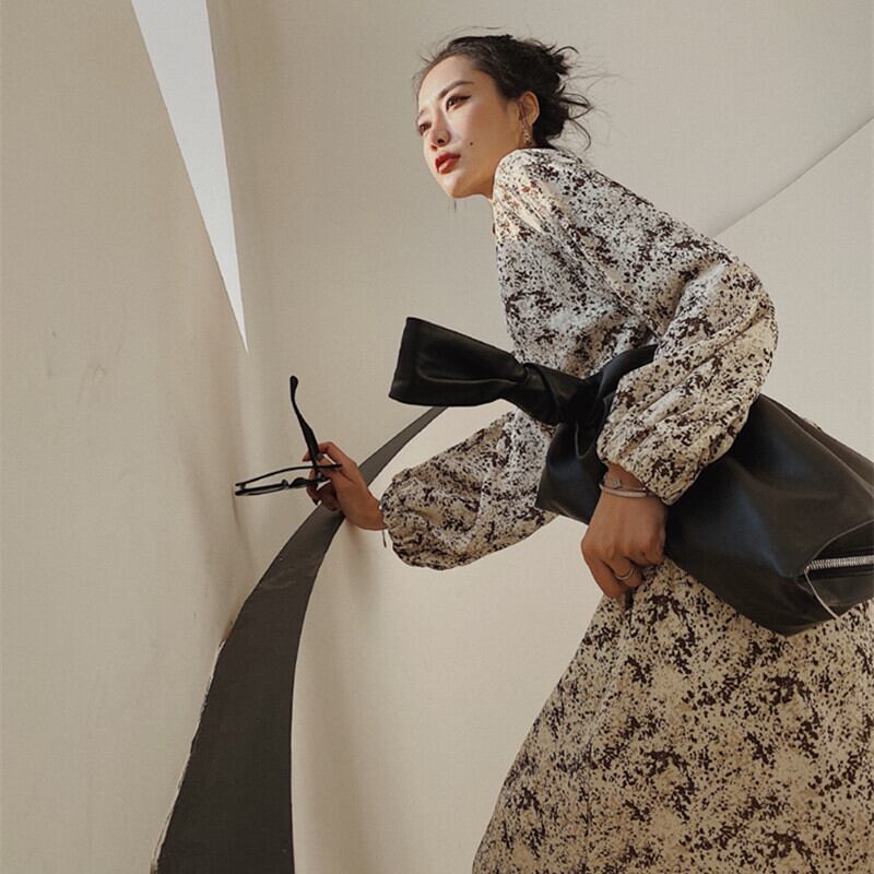 秋物韓国ファッションNEWウェスト薄手スタンダードフローラルワンピーススカート レトロ オータム 花柄 ウエスト ミドル丈 GroundMODE445990943372 | pleglad Ground