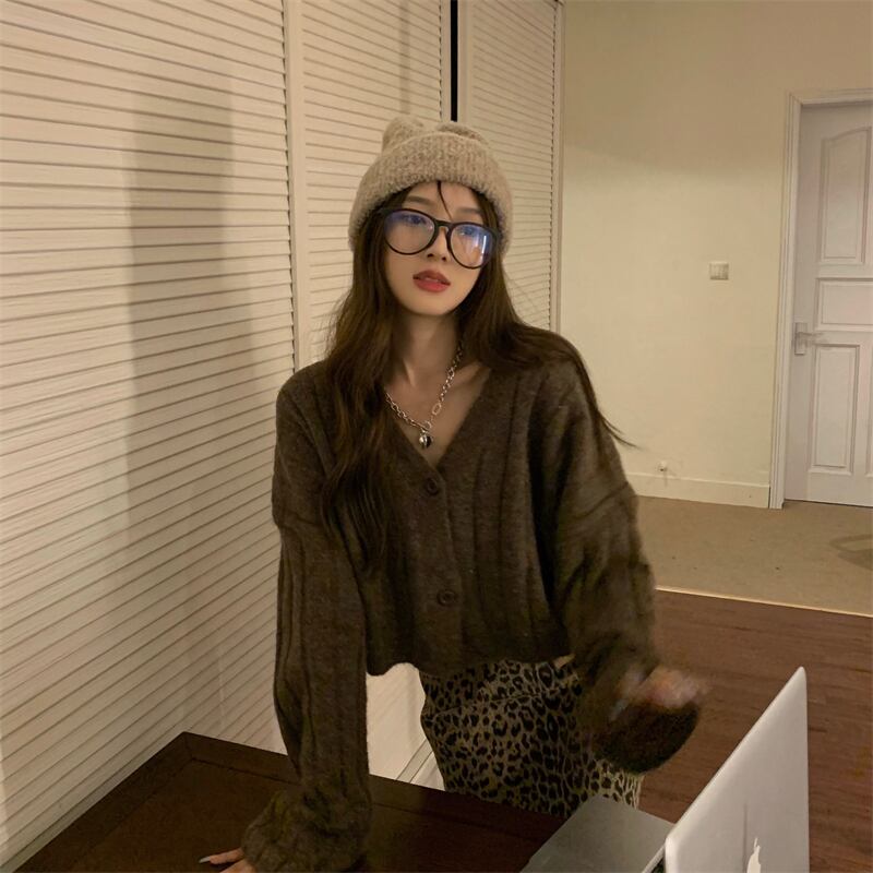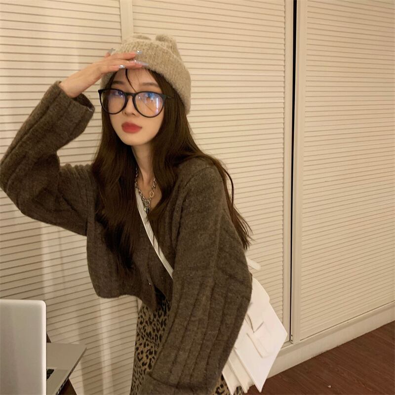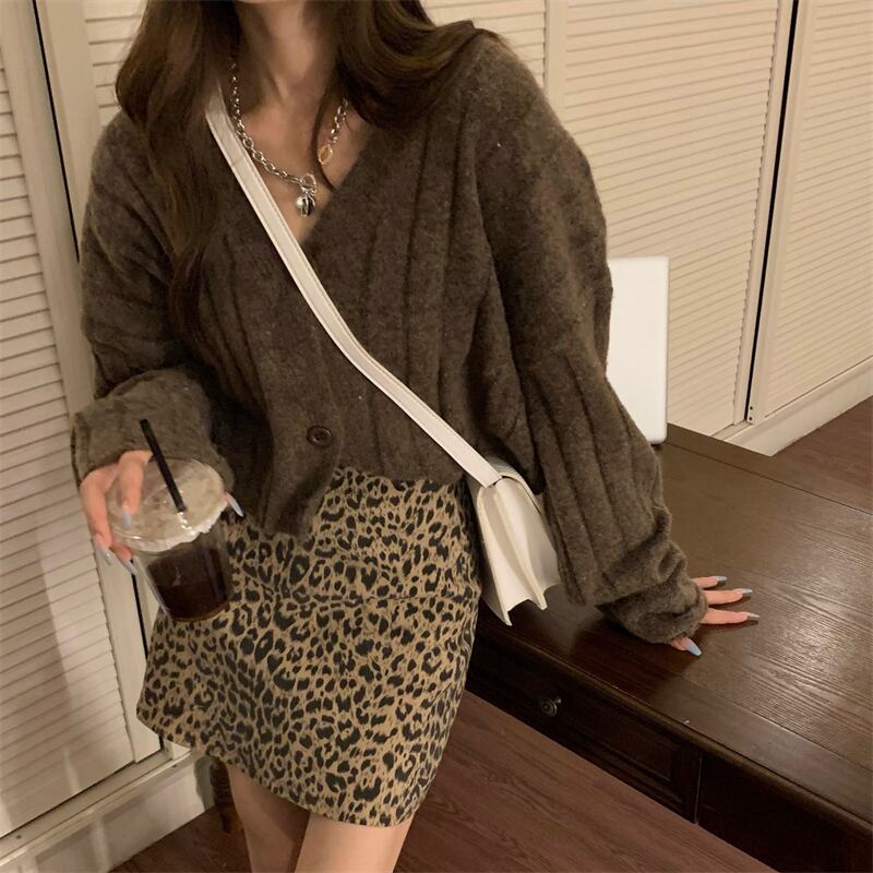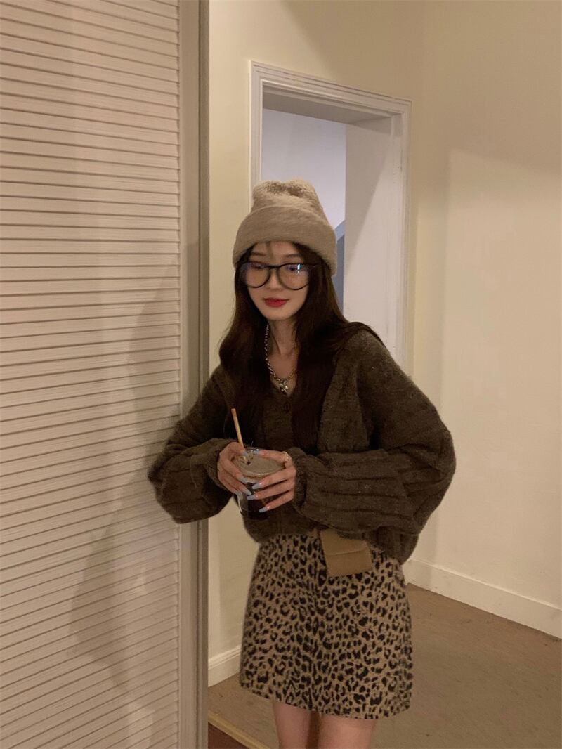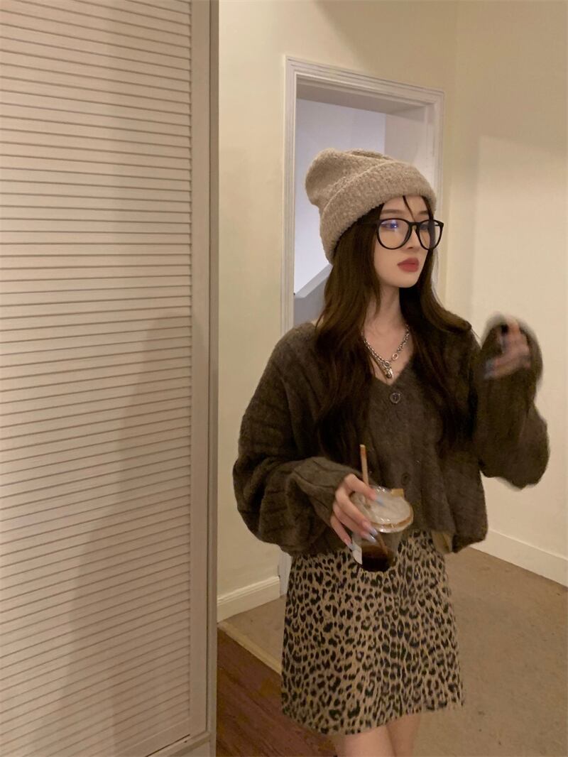 スタンダードカラーVネックウールショートニットカーディガンレディースレオパードプリント柄Aラインスカート スプリング秋物 レトロ 春物 オータム GroundMODE422906363906 | pleglad Ground