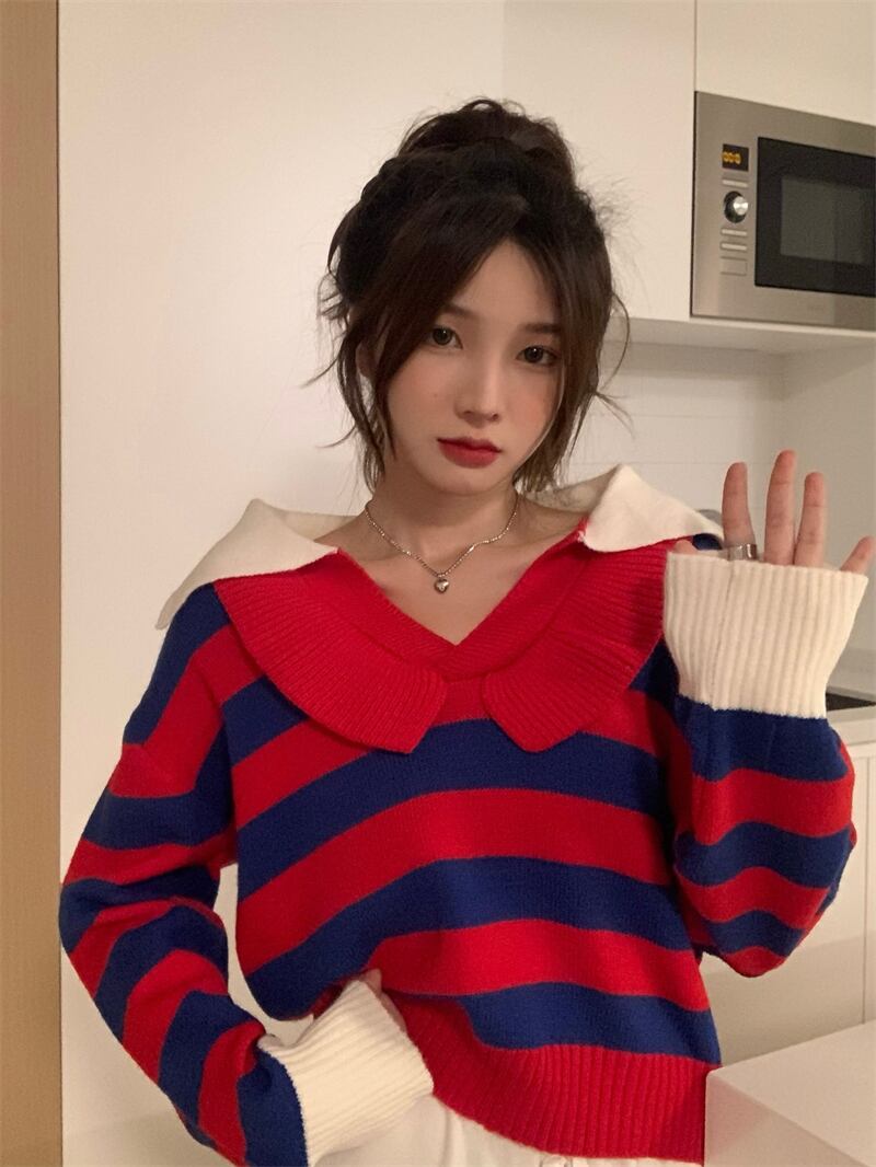 カラーレッドストライプセーター レディースプルオーバー トップス 秋物ウィンター ロング 大人ガーリー スウィート キュート カジュアル オータム 冬物 長袖 GroundMODE450870969616 | pleglad Ground