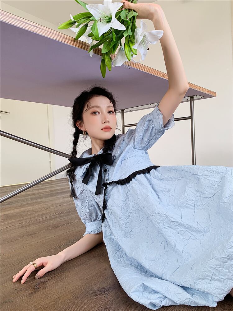 ブループリーツカラーワンピース夏服ルーズ薄手スリーブAラインスカート 大人ガーリー スウィート キュート カジュアル 夏物 GroundMODE233427046886 | pleglad Ground