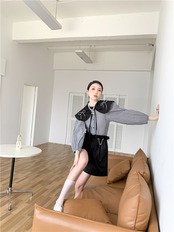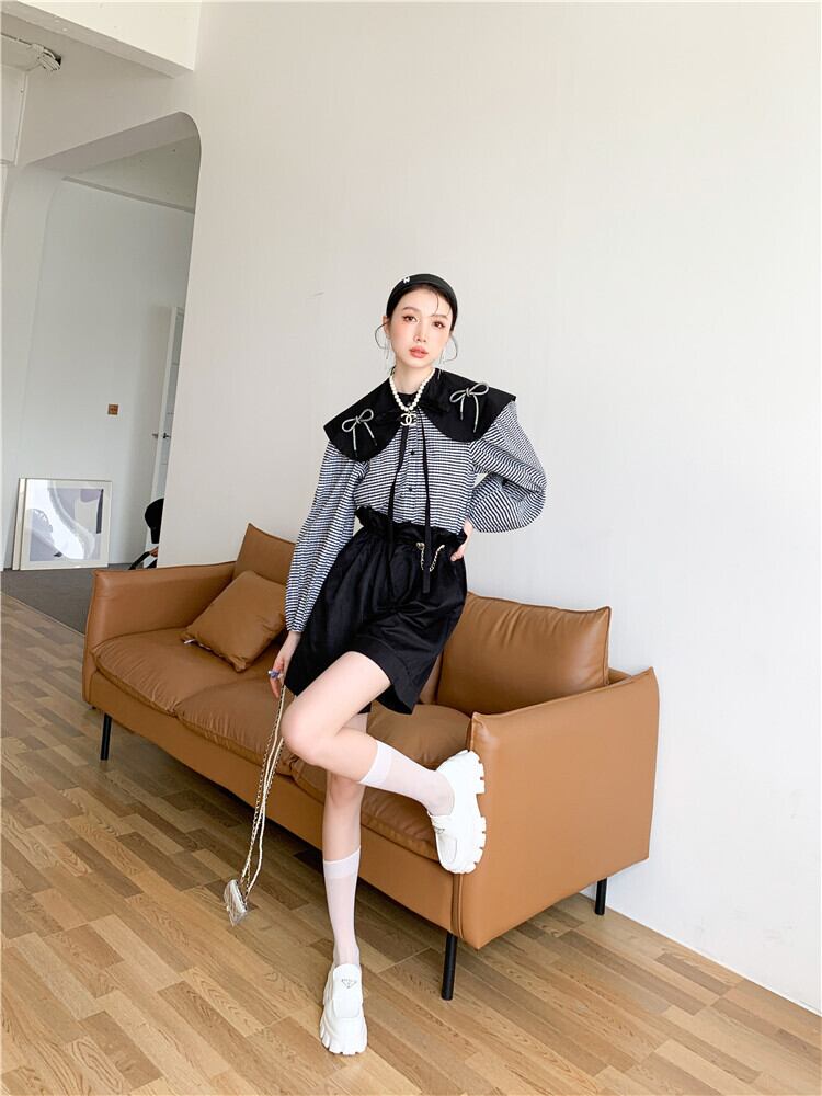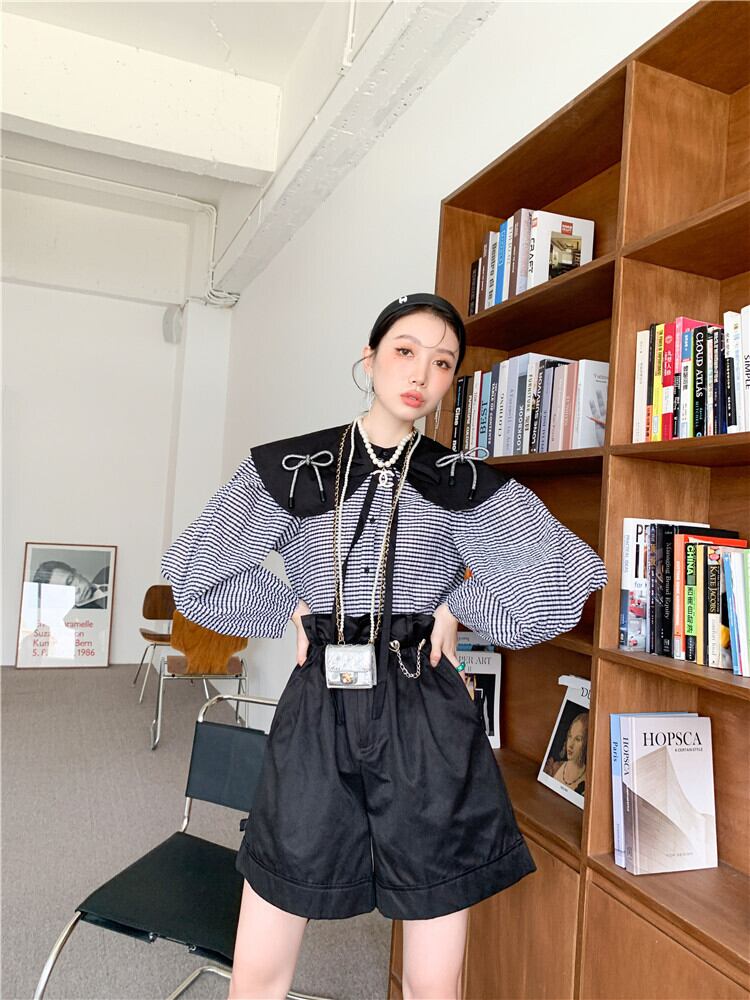 色:黒いシャツ,ブラックワイドレッグ5点パンツ1811A