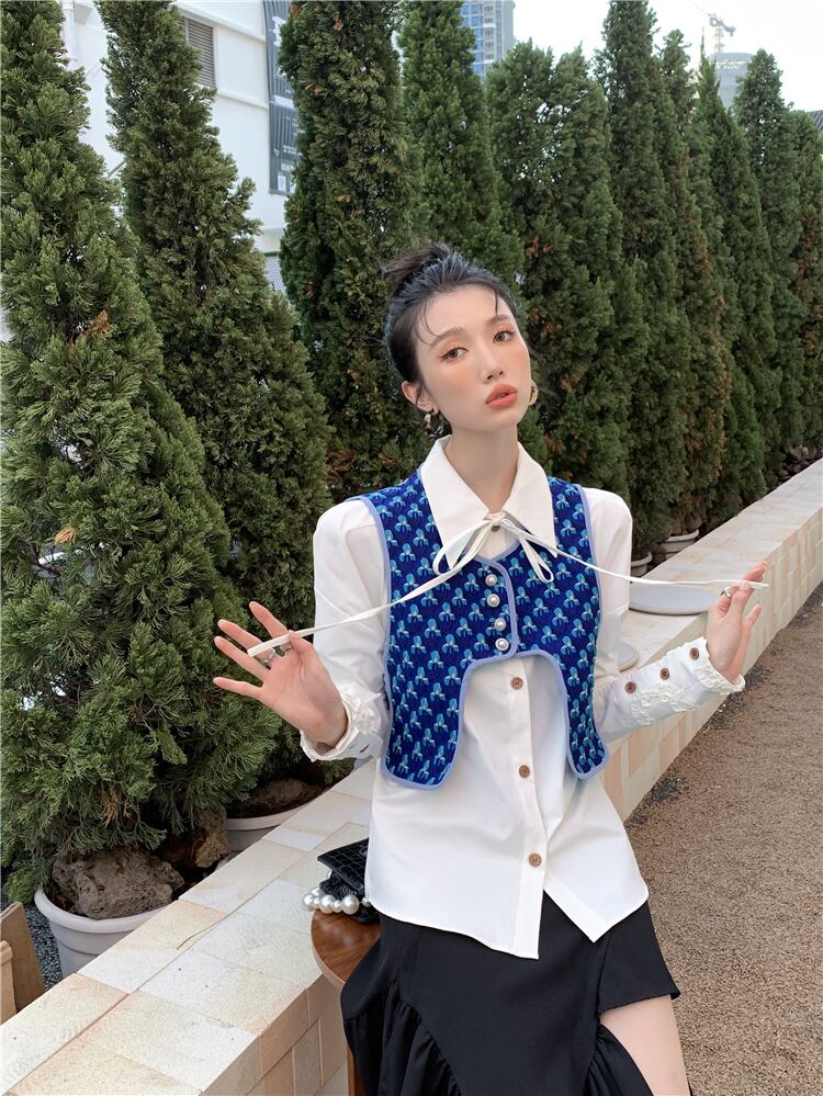 色:白のシャツ,ジャカードパールバックルベスト
