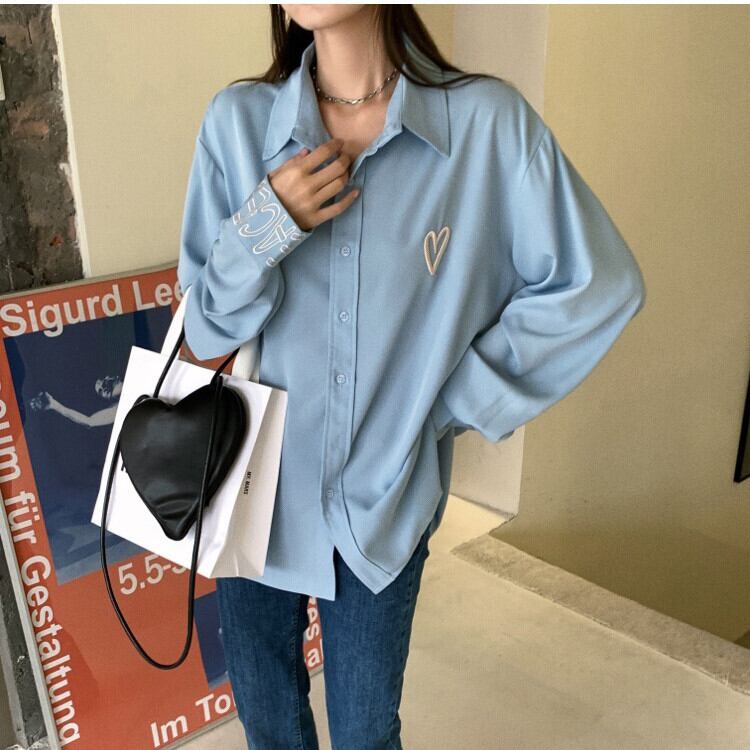 ブルーシャツ レディース秋物スタンダードスタイルルーズ韓国ファッションブラウス ロング レッド レトロ 刺繍 オータム 長袖 GroundMODE441492503826 | pleglad Ground