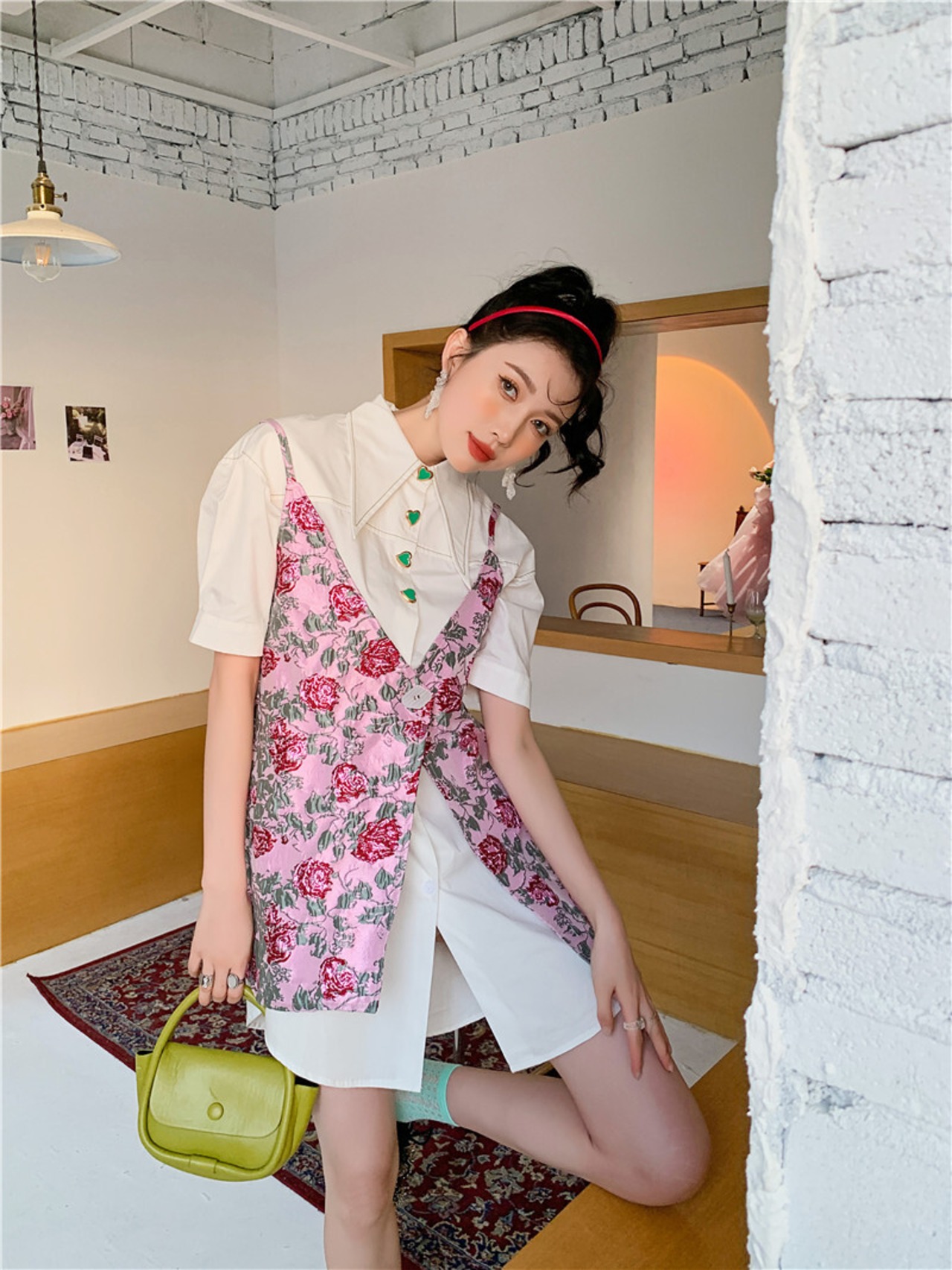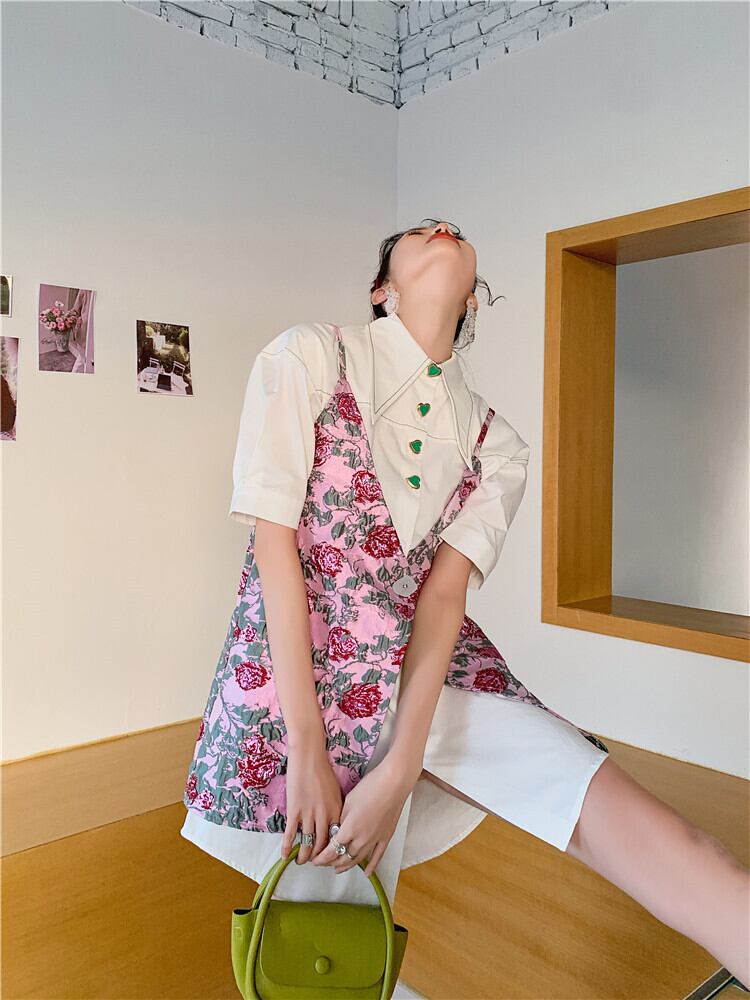色:白のシャツ,フローラルベスト