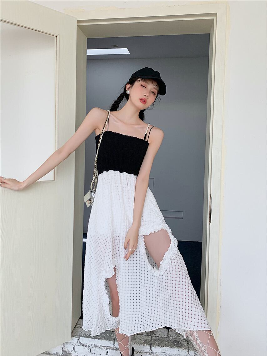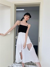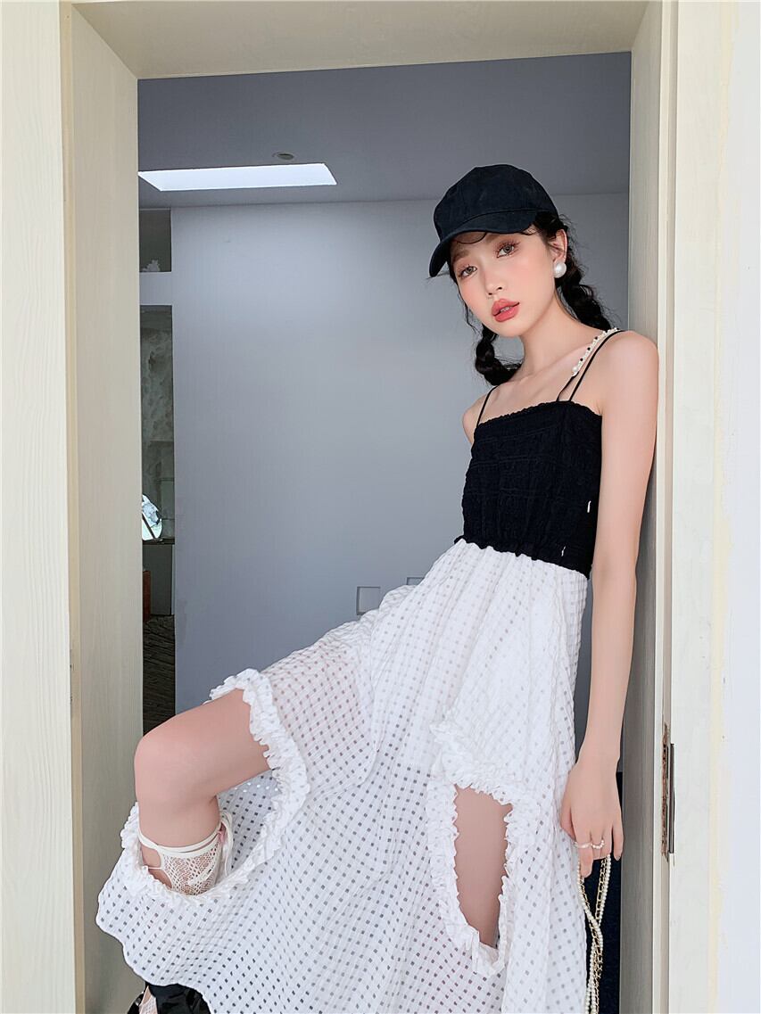 色:黒と白のカラーマッチングサスペンダースカート,白いチョッキ