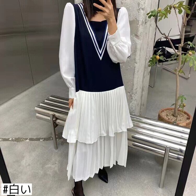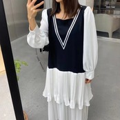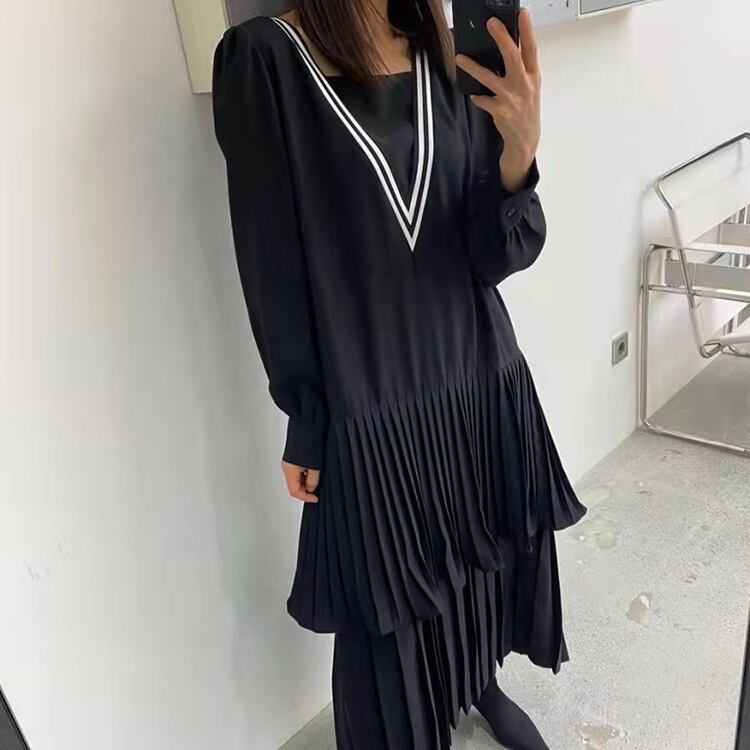 韓国ファッションワンピースミニマリストスタイル秋物ルーズ薄手プリーツスカート ロング オータム 長袖 GroundMODE90719512770
