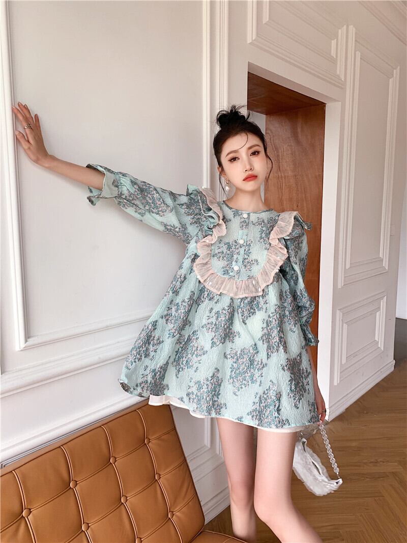 スプリンググリーンFlowerデザイン レースサイドスリーブ長袖ショートワンピース ロング ピンク 春物 フラワーデザイン GroundMODE279918526208 | pleglad Ground
