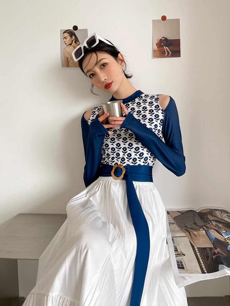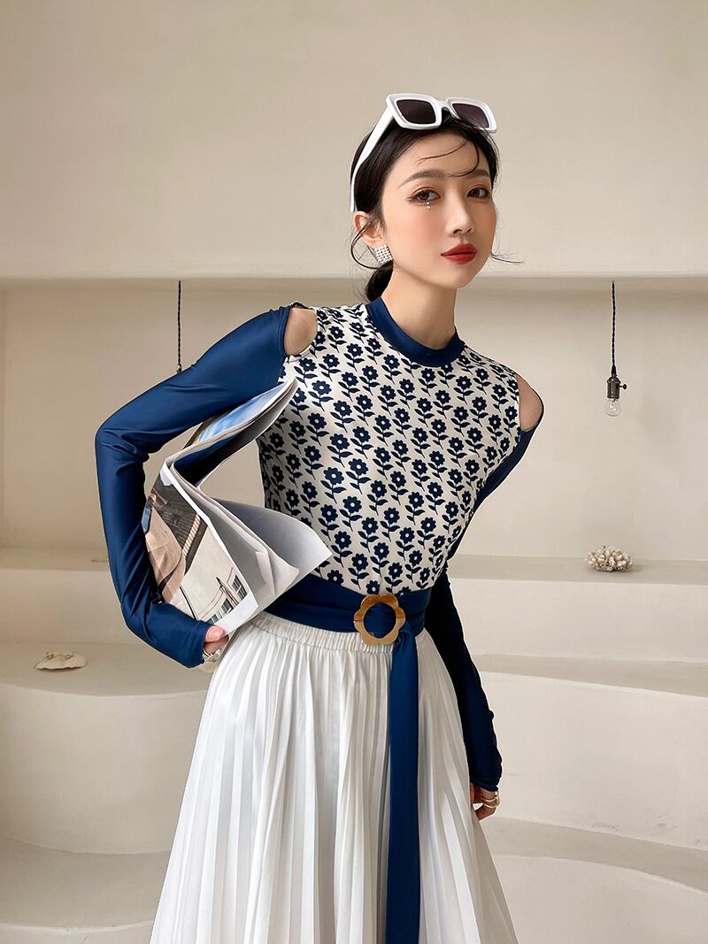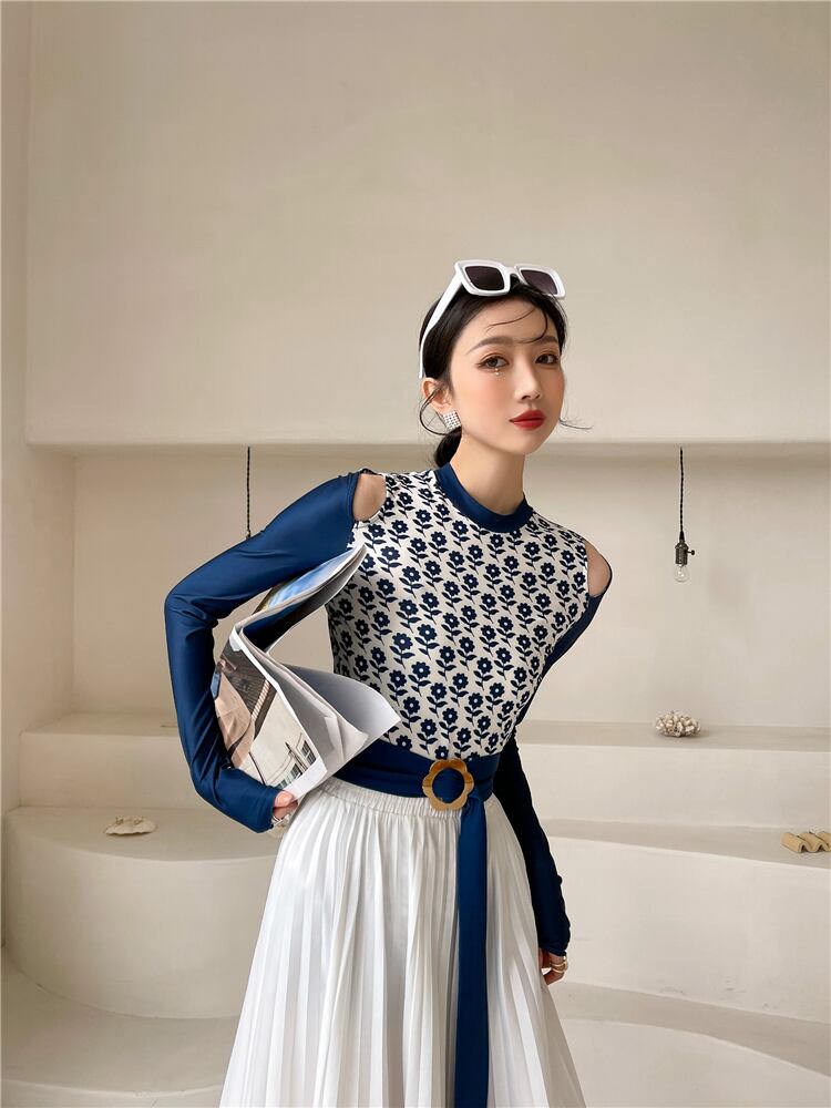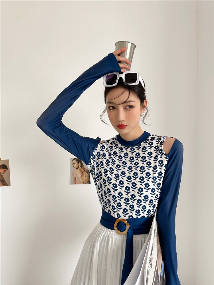 スタンダードフローラルスリムラウンドネックシャツ Tシャツトップス レディース ロング レトロ 花柄 Oネック オフショルダー 長袖 GroundMODE240517406664 | pleglad Ground