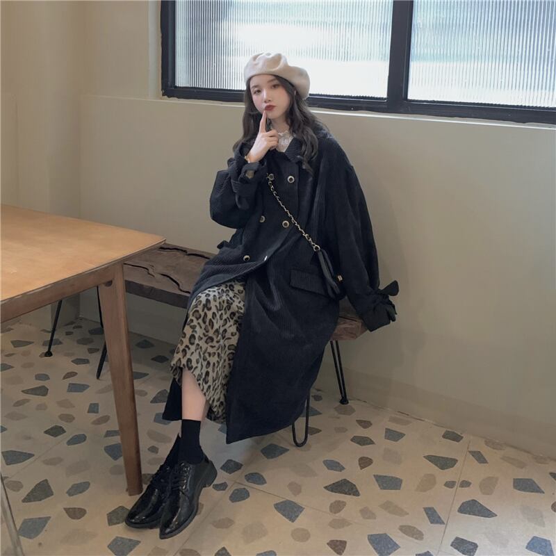秋物ウィンタースタイルスタンダードダブルブレストブラックコーデュロイコート ジャケット レディース レトロ オータム 冬物 ミドル丈 GroundMODE465016020054 | pleglad Ground