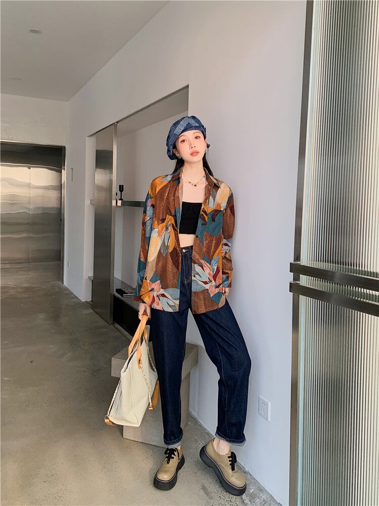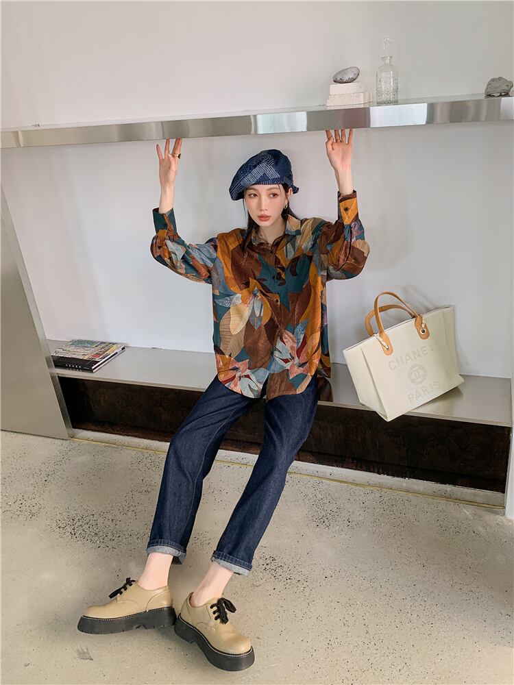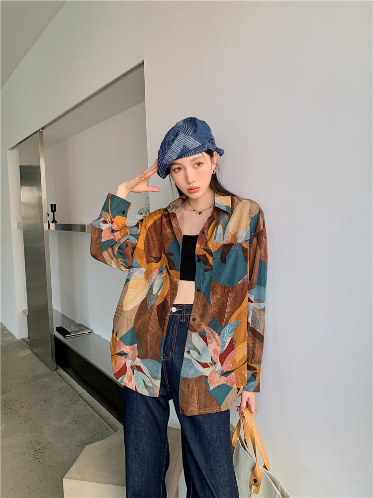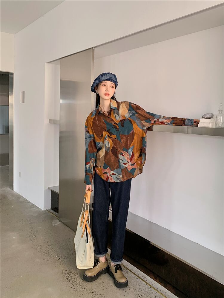 スプリング秋物スタンダードカラープリントルーズシャツ レディースヴィンテージ ロング レトロ 春物 オータム ビンテージ 長袖 GroundMODE276450055769 | pleglad Ground