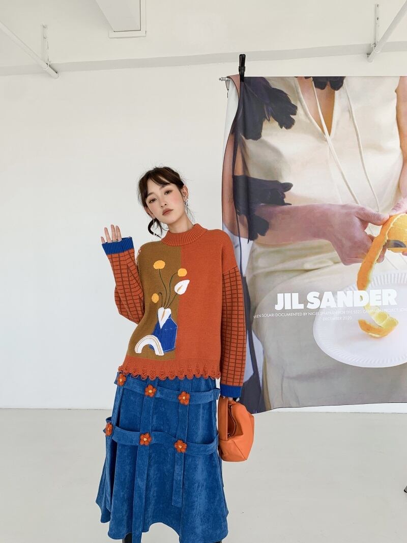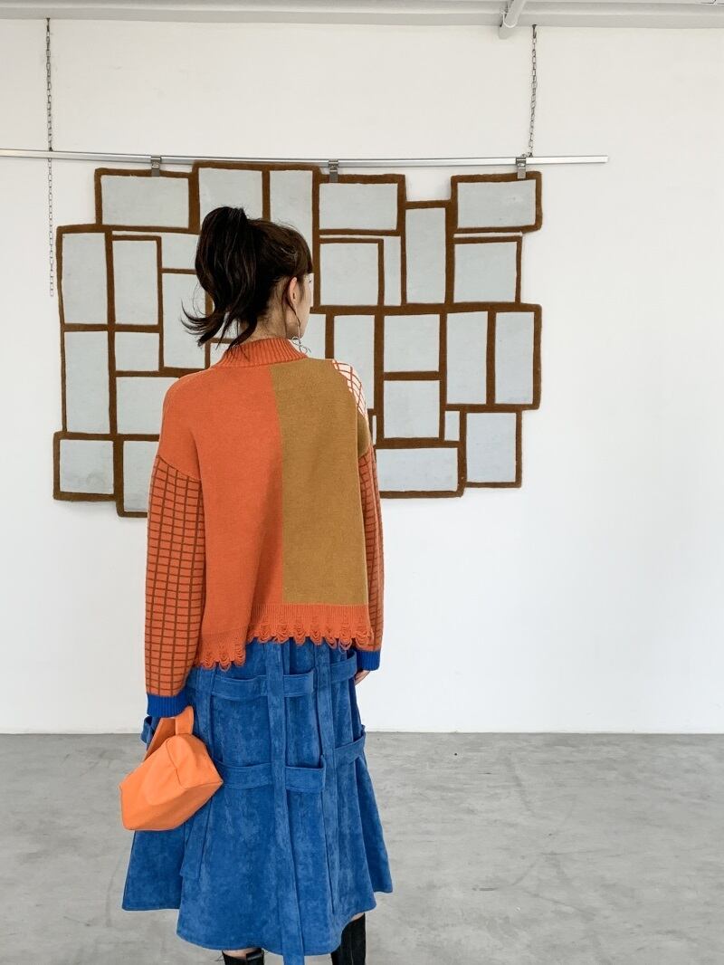 色:カラーブルーのスカート,キャラメルカラーブロックセーター