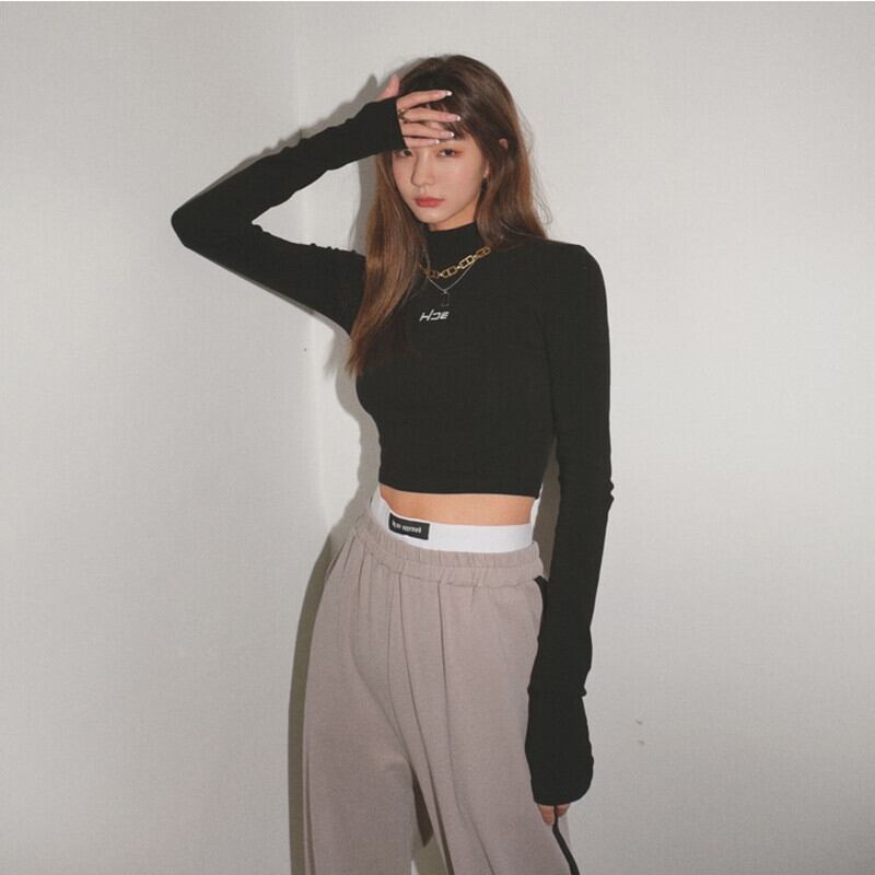 ブラックカラーゆったりシャツ レディーススプリング秋物トップス ハイウェストショートクロップドTシャツ夏服 ロング 春物 夏物 オータム 長袖 ウエスト GroundMODE437481251175 | pleglad Ground